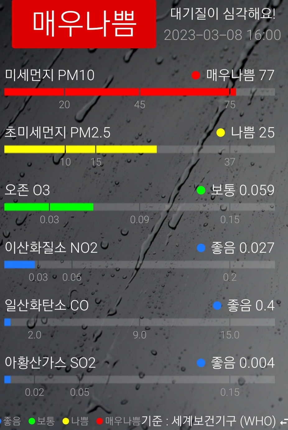 흐리고 곳에 따라 빗방을이 들었다지만 시원하세 내리지 않아서인지 미세먼지는 여전히 나쁨