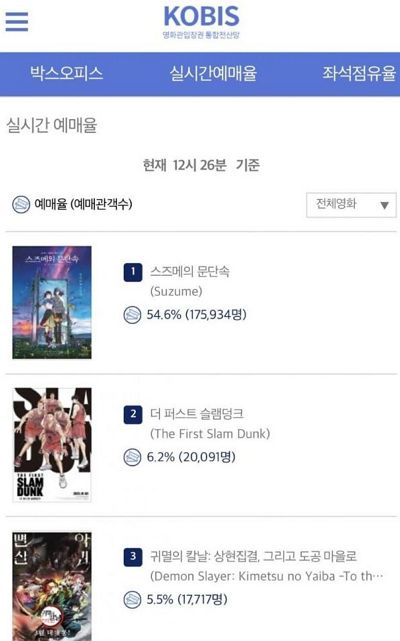 2023.3월 둘째주, 한국 극장 예매율 순위 1, 2, 3위가 일본 애니메이션 본문