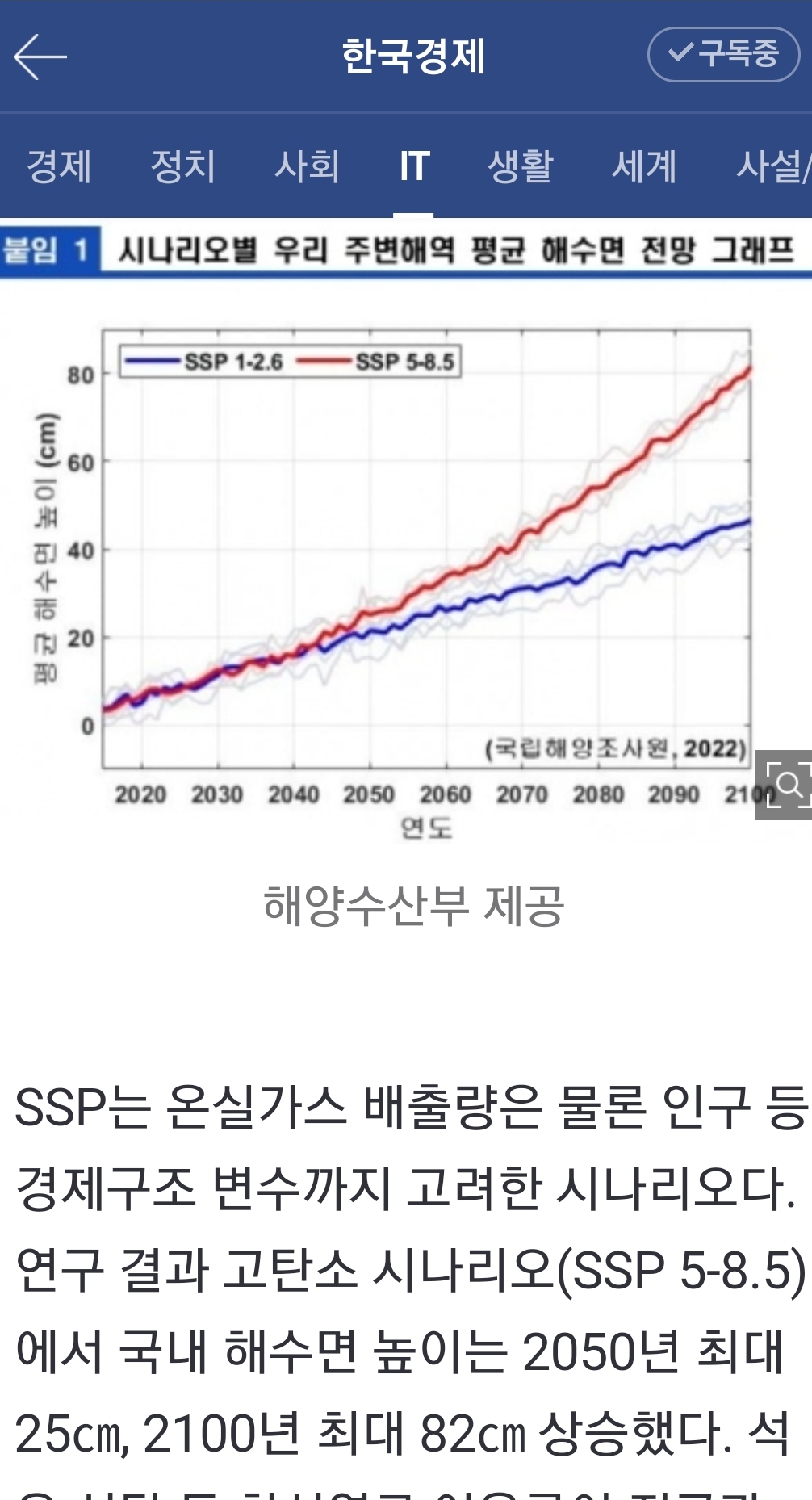 기후변화로 한국 해수면이 2100년까지 최대 82㎝ 상승할 수 있다는 전망이 나왔다. 해수면 상승 여파로 일부 국내 연안이 침수될 수 있다는 우려마저 나오고 있다. 9일 해양수산부 국립해양조사원