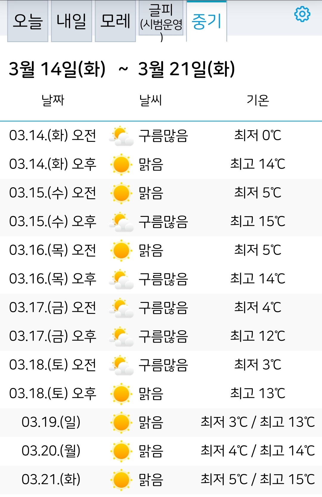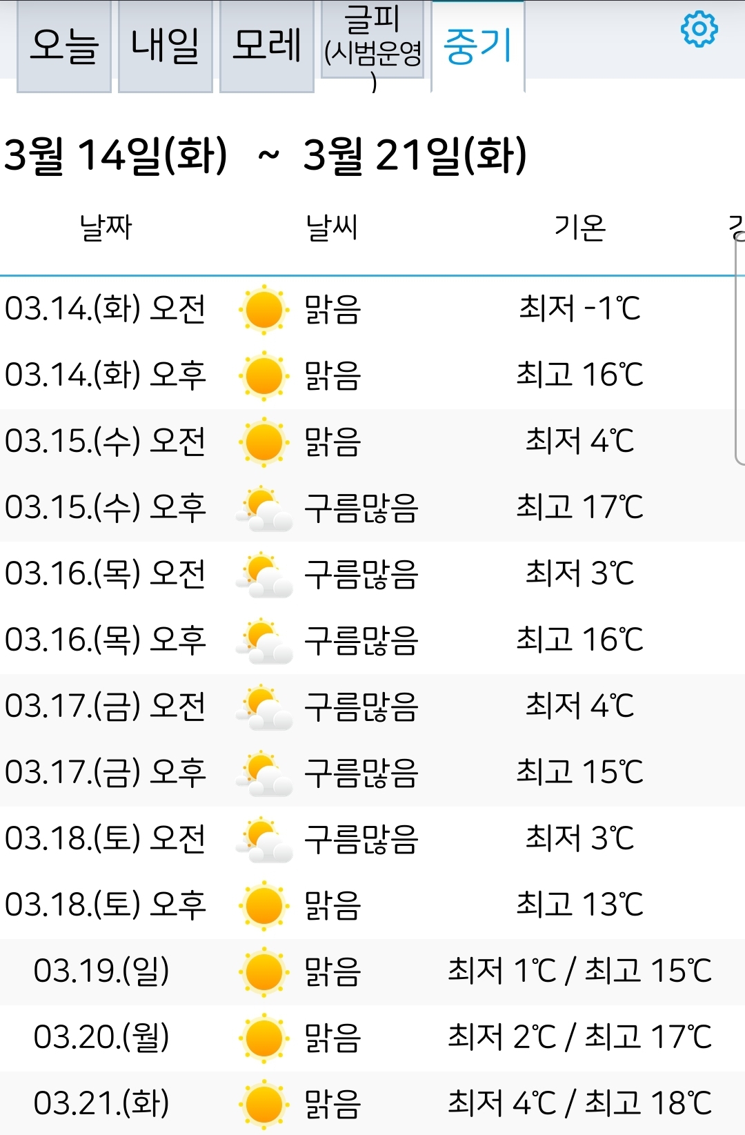 ※ 단기부분은 원기날씨앱, 중기부분은 기상청 날씨누리입니다. 조금 차이납니다.