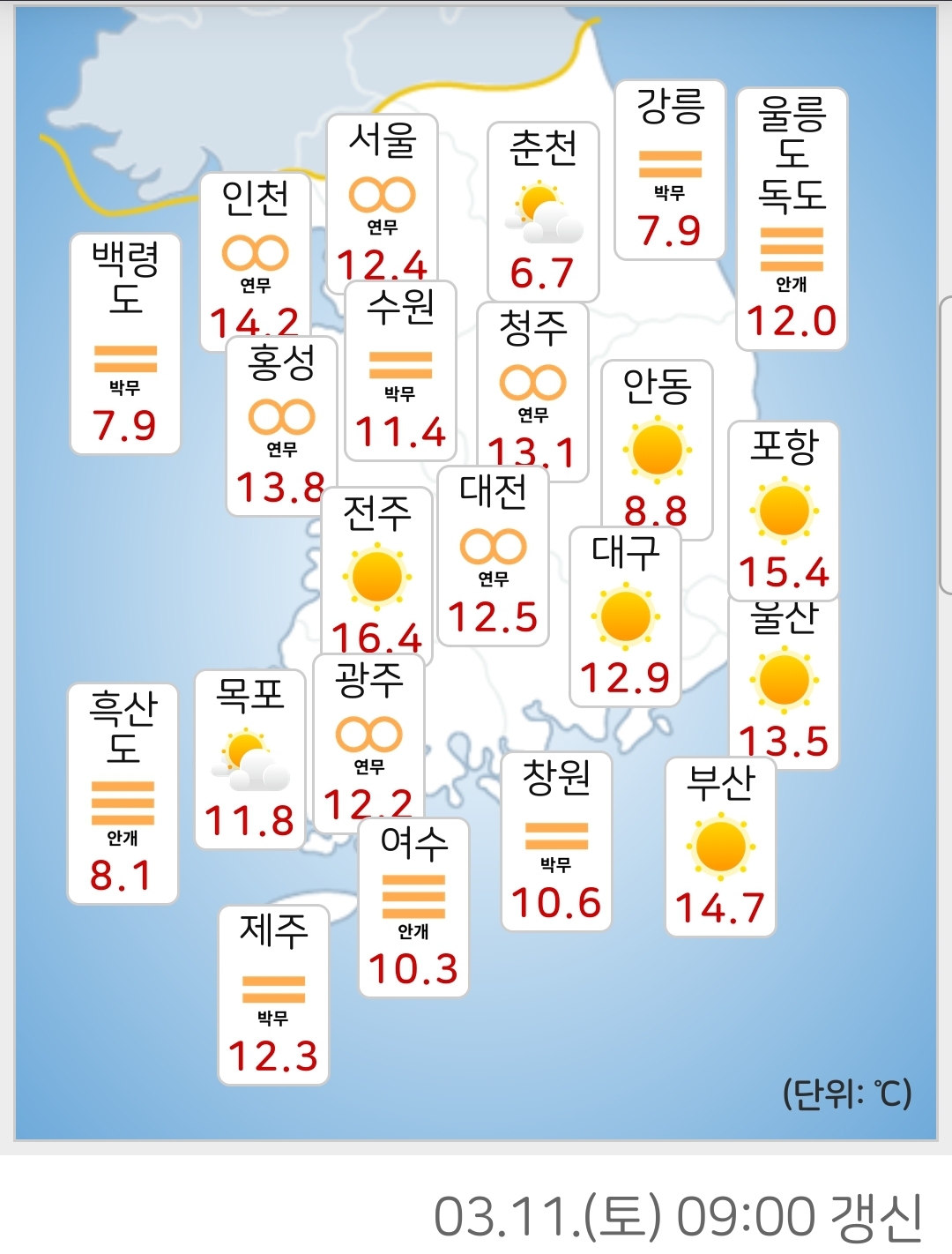 | 흐린 중부지방을 제외한 전국 기온이 20도 내외 (0) | 2023.03.08 |