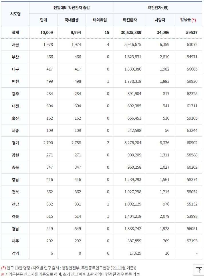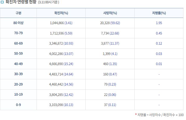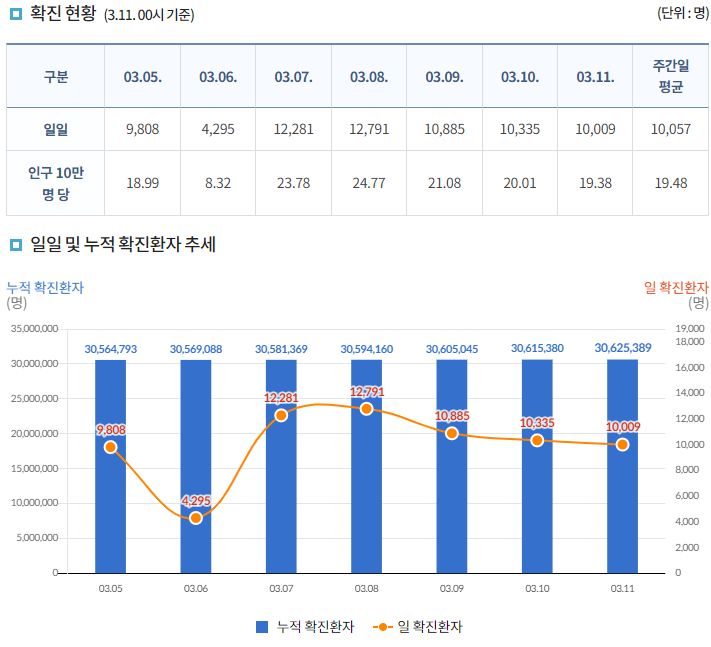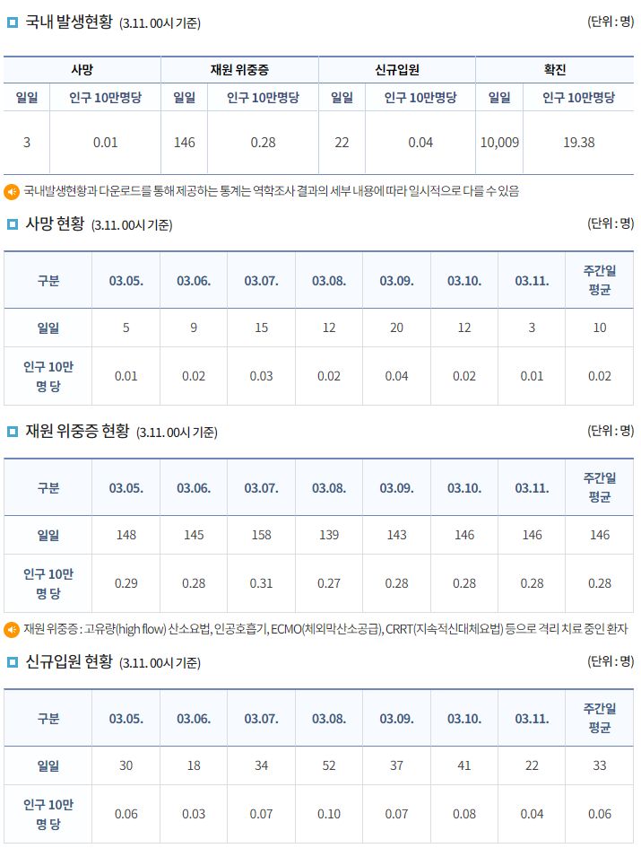 코로나19집계(2023.3.11. 0시기준) 확진 +1만, 사망 +3명, 중환자병상가동률 25% 본문