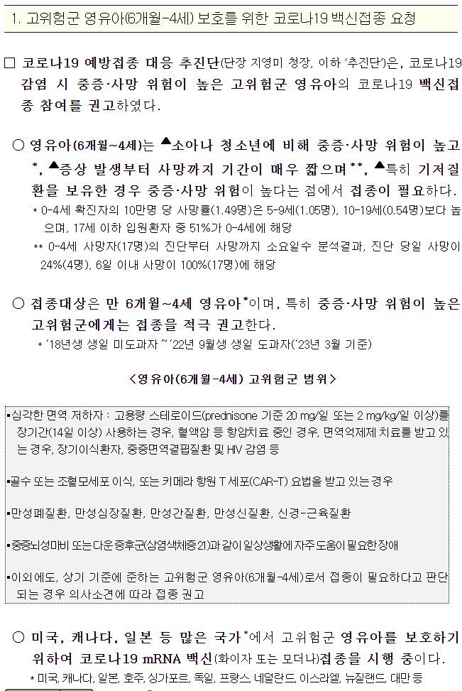 고위험군 영유아(6개월-4세) 보호를 위한 코로나19 백신접종 요청