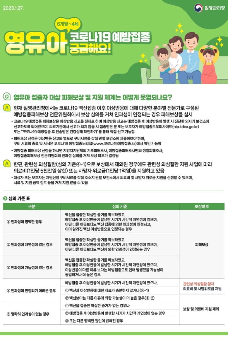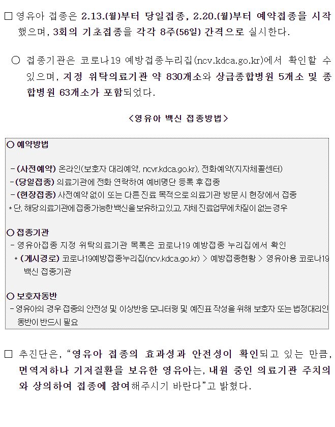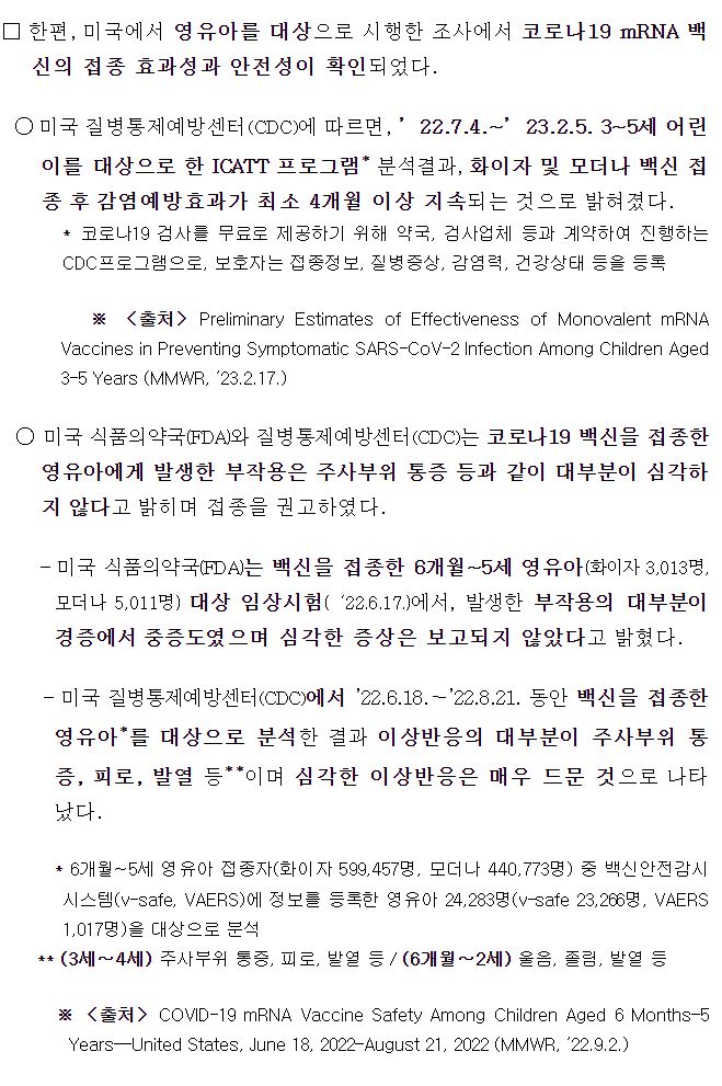 "영유아 대상 연구에서 코로나19 백신접종의 효과성이 확인*되었으며, 이상반응의 대부분이 주사부위 통증, 피로, 발열 등 경증으로 나타남. 고위험군 영유아는 코로나19에 감염될 경우, 중증·사망 위험이 높아지는 만큼 적극적인 접종 참여 필요" - 질병관리청