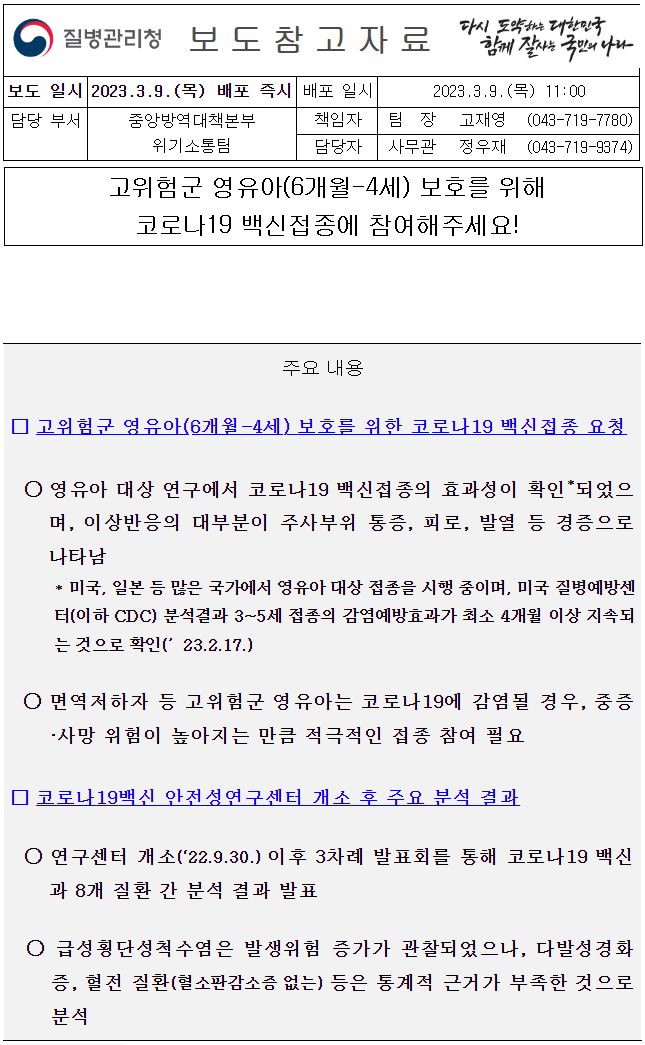 코로나19(2023.3.9)고위험군 영유아(6개월-4세) 보호를 위한 코로나19 백신접종 요청 및 안내문(홍보자료) 본문