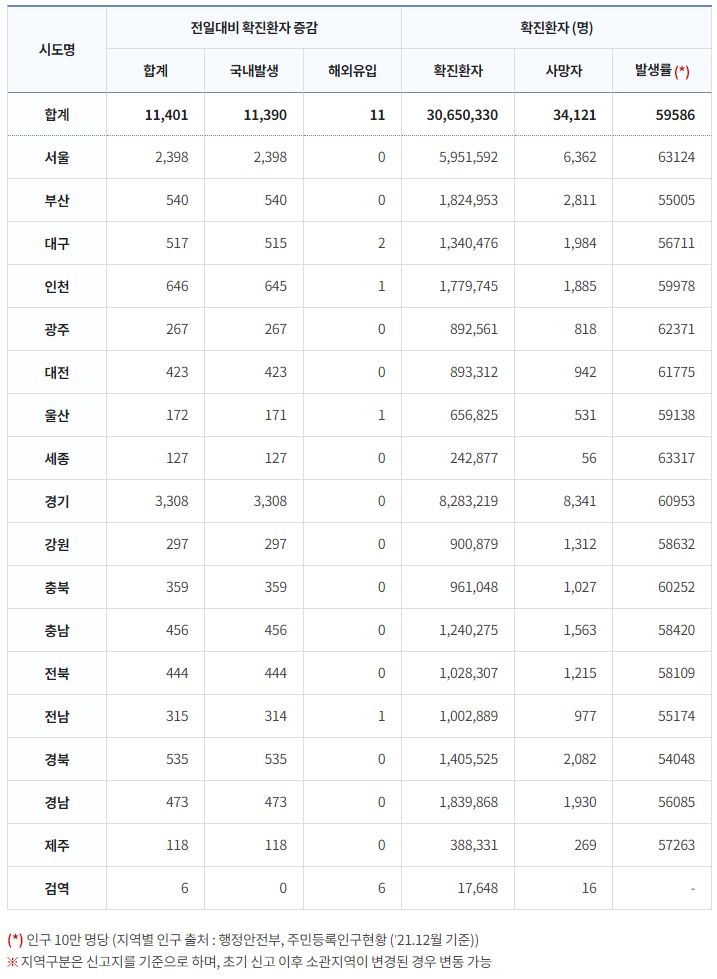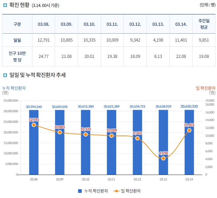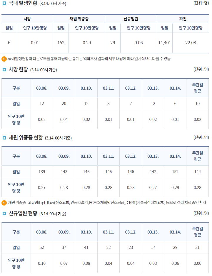 코로나19집계(2023.3.14. 0시기준) 확진 +1.1만, 사망 +6명, 중환자병상가동률 25% 본문