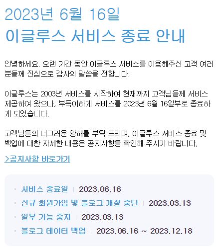 슬픈 소식이 하나 날아왔습니다. 이글루스가 2023년 6월 16일부로 문닫는다고 합니다.