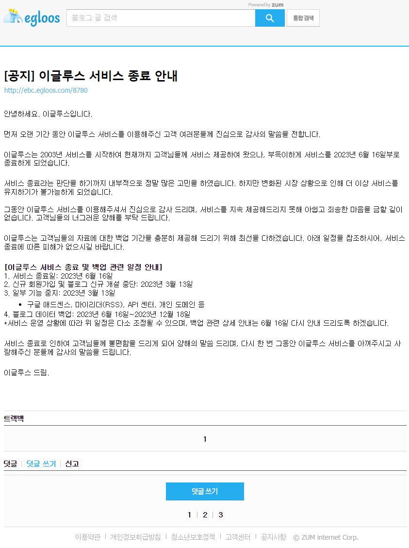 슬픈 소식이 하나 날아왔습니다. 이글루스가 2023년 6월 16일부로 문닫는다고 합니다.