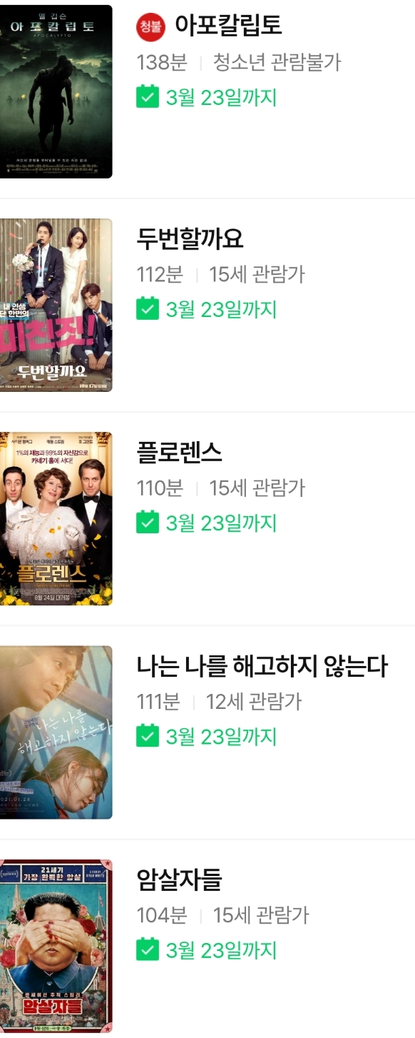 ~3.23.까지.. 아포칼립토, 두번할까요, 플로렌스, 나는 나를 해고하지 않는다, 암살자들, 여고괴담 여섯번째 이야기:모교.