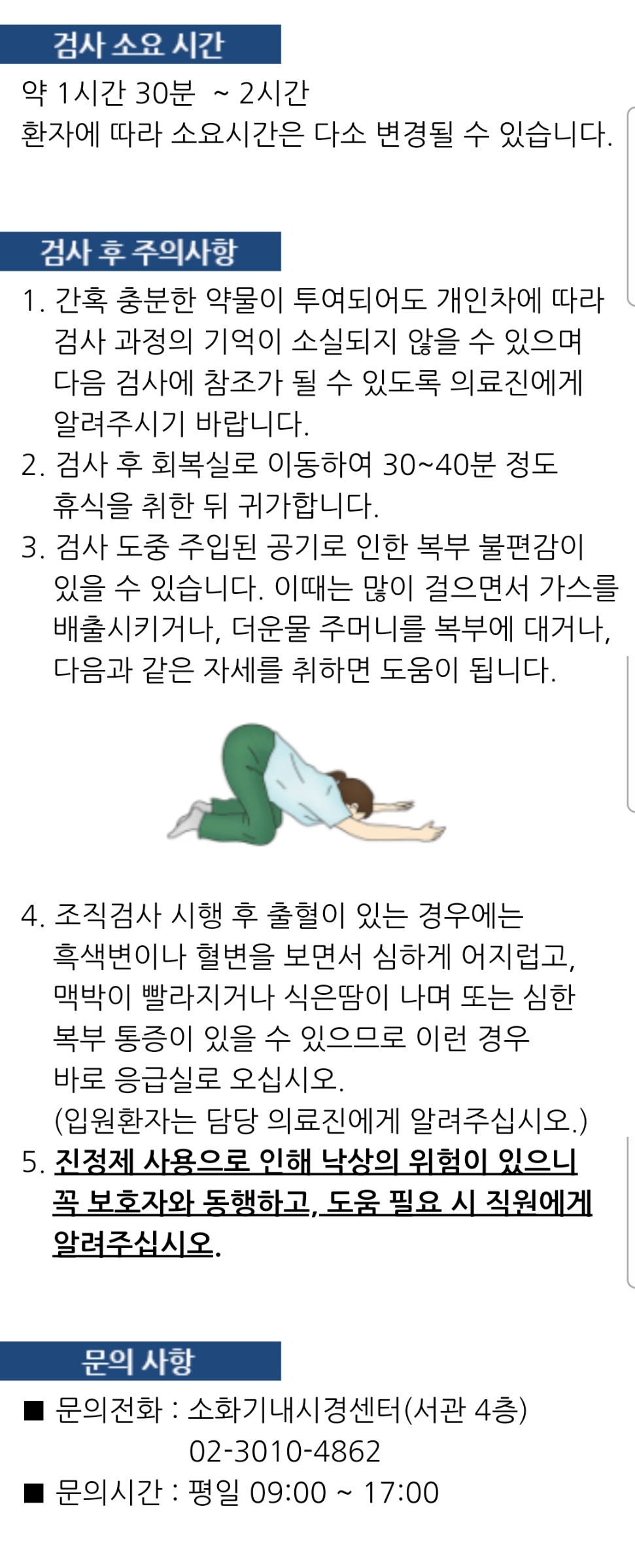 * 몇 만 명에 한 명 정도는 귀가한 다음 출혈이나 염증이 생길 수 있으므로 몸상태를 잘 보고 문제가 있으면 병원에 와서 치료받을 것. 극히 드물지만 만약 고열, 오한, 빠른 맥박이나 심한 혈압변화, 심한 복부통증, 혈변 등으로 다른 병원에 가는 일이 생겼다면 반드시 대장내시경검사를 했음을 119대원과 담당의사에게 꼭 말할 것.2