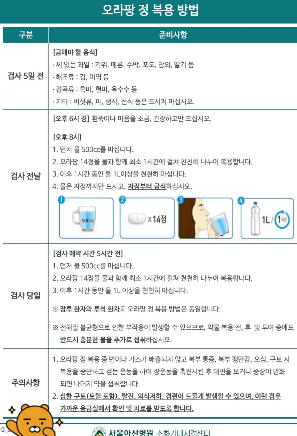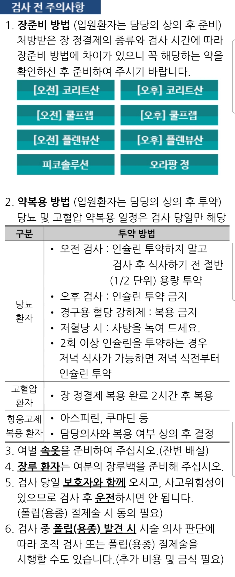 장을 비우는 장정결제(하제)는 위 안내문에도 나오듯 몇 가지가 됩니다. 코리트산, 쿨프랩, 폴린뷰산, 피코솔루션, 오라팡정 등. 그 중 하나를 처방받게 됩니다. 액상일수도 있고 알약일수도 있습니다. 보통 검사일 -1, -2, -3일부터 음식을 지침에 따라 가려 먹어야 하고, 1일 전부터는 하제를 복용해야 합니다. 서울아산병원의 경우 검사일 -5일 전부터 식사를 가려먹으라고 안내하고 있습니다.