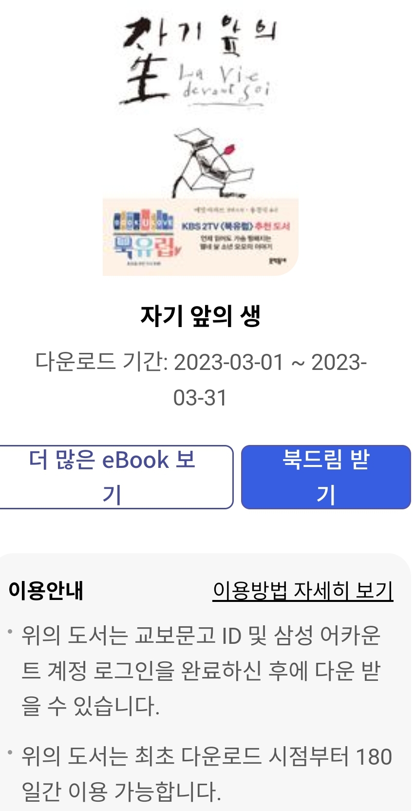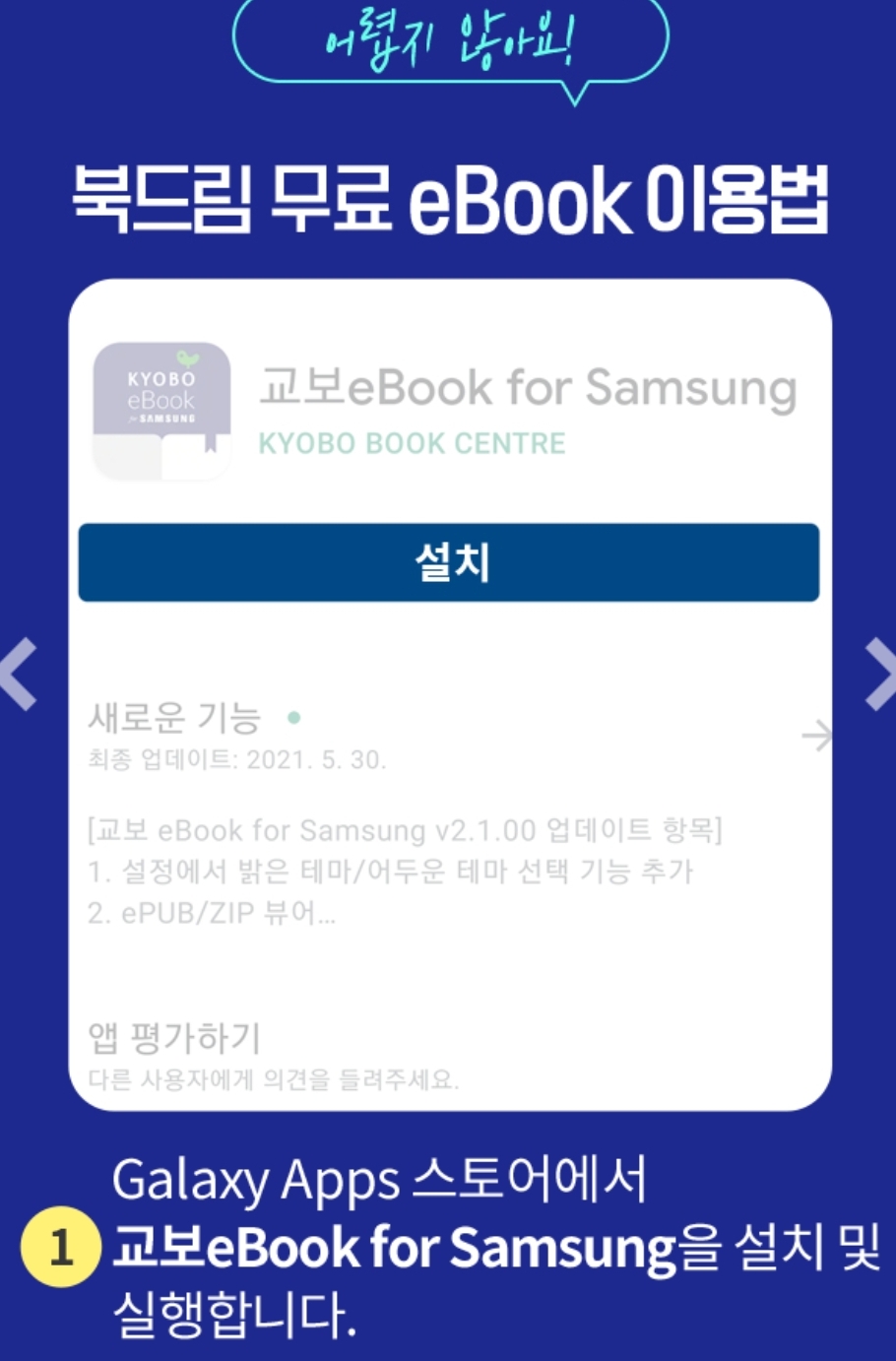 교보ebook for samsung 앱을 설치한 다음 실행하면 그달의 북드림도서(그리고 덤으로 국내 판타지도서) 무료대여이벤트 화먼이 뜹니다.