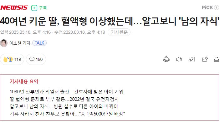 기사내용 요약 1980년 산부인과 의원서 출산…간호사에 받은 아이 키워 딸 혈액형 문제로 부부 갈등…2022년 결국 유전자검사 알고보니 남의 자식…병원 실수로 다른 아이와 바뀌어 기록 사라져
