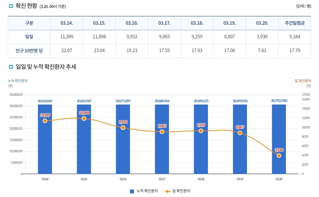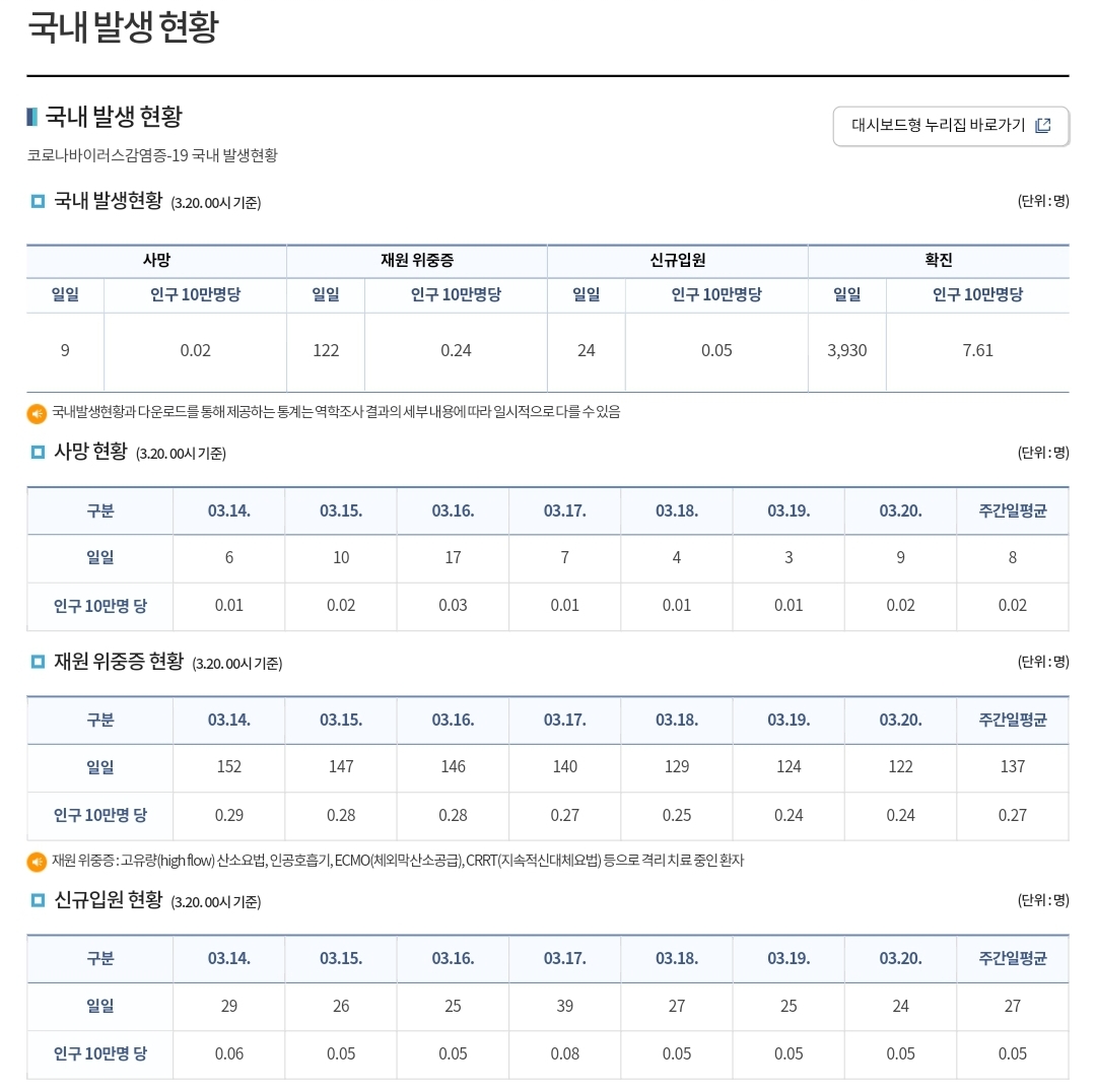 코로나19집계(2023.3.20. 0시기준) 확진 +4천, 사망 +9명, 중환자병상가동률 25% 본문