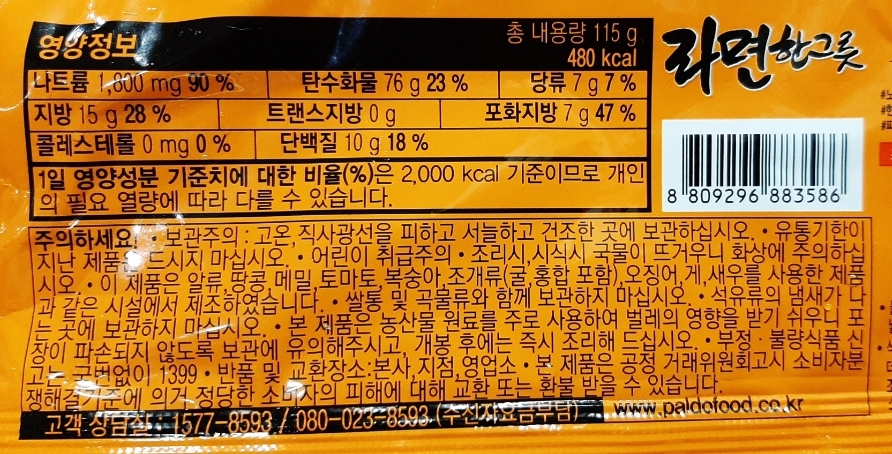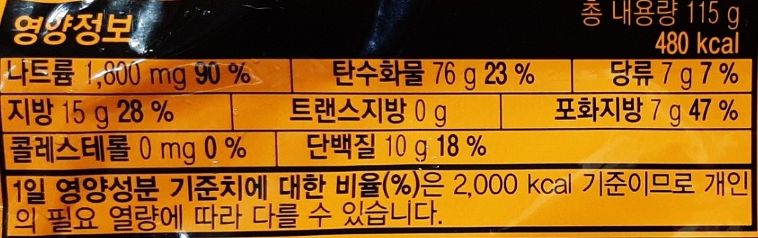 115그램, 480칼로리, 나트륨함량은 1800mg입니다. 나트륨(소디움)은 1봉지에 1650그람 등인 멏몇 봉지라면들보다는 좀 있는 편.