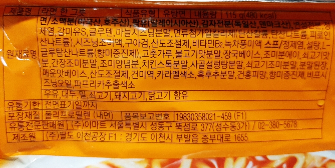 115그램, 480칼로리, 나트륨함량은 1800mg입니다. 나트륨(소디움)은 1봉지에 1650그람 등인 멏몇 봉지라면들보다는 좀 있는 편.