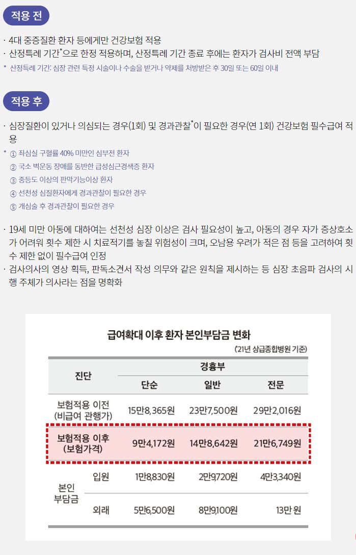 심장초음파는, 의사가 심장질환이 의심되어 시행하는 경우 2021년 9월부터 보험급여.