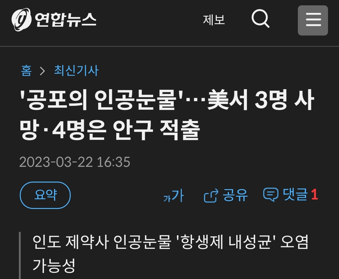 (서울=연합뉴스) 유한주 기자 = 미국에서 특정 제약사의 인공 눈물을 사용했다가 시력을 잃거나 심지어 사망하는 사례가 잇따르고 있다. 미국 식품...