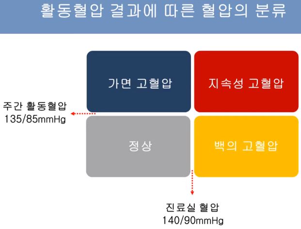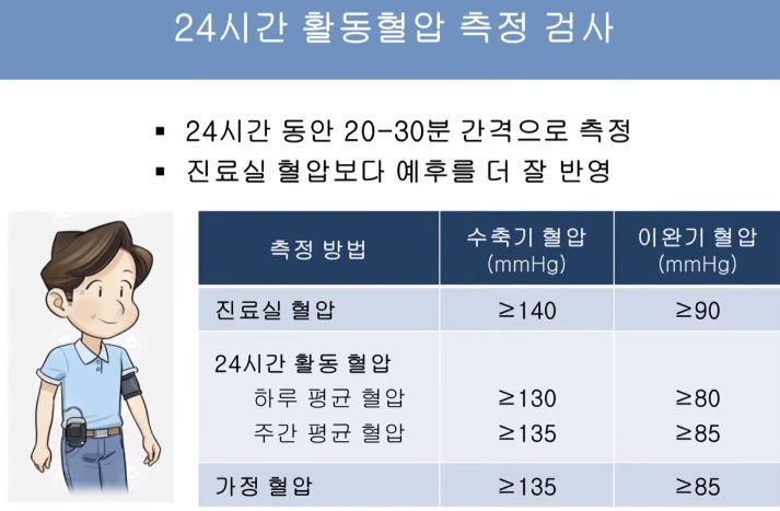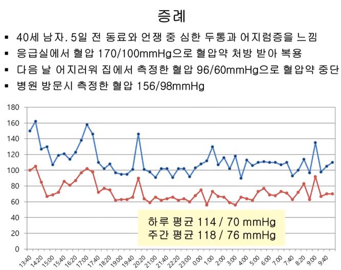 증례와 같이 단정하기 힘든 경우, "24시간 활동혈압 혈압 측정 검사"를 할 수 있다. 몸에 다는 기기를 처방(대여)받아 생활하며 측정한 값을 바탕으로 고혈압 여부 진단. 위와 같은 경우, 하루와 주간 평균 혈압은 정상범위라서 약물치료는 필요없다고 판단.