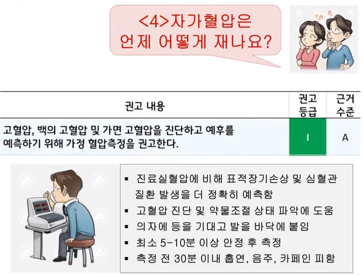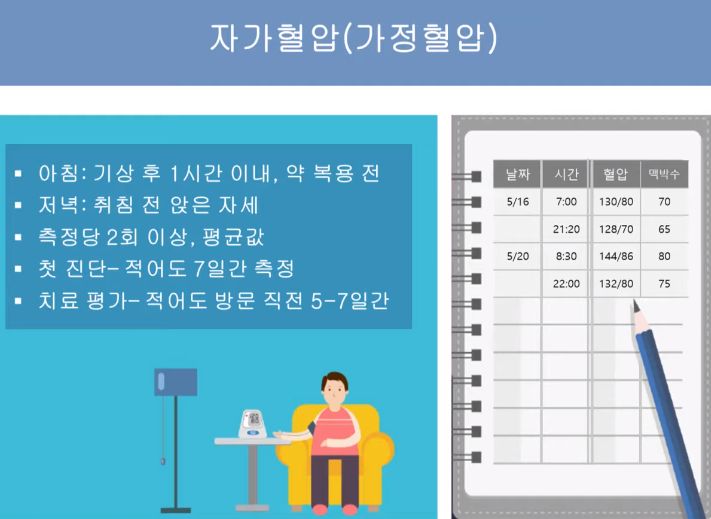 특히, 진료 후 처방받고 첫 며칠, 그리고 병원 외래 전 며칠 동안은 촘촘하게 자주 혈압을 재서 기록을 가져오면 약물치료에 도움이 된다.