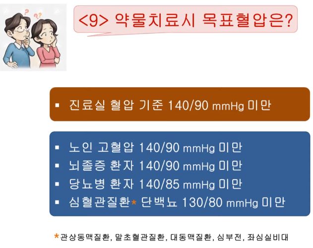 특히, 고혈압이면서 당뇨병이나 신장질환, 이상지질혈증, 뇌혈관질환 등을 이미 가지고 있거나 고령 등 위험인자가 있다면, 고혈압의 합병증이 발병한 상태라고 판단하고 더 엄격한 혈압관리(= 더 낮은 목표혈압)를 해야 한다. 물론, 약을 처방받아야 한다는 뜻.
