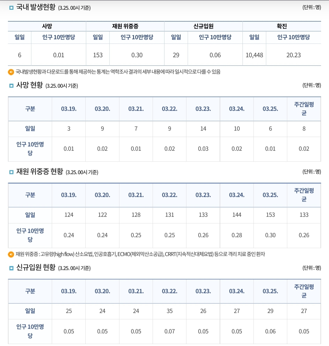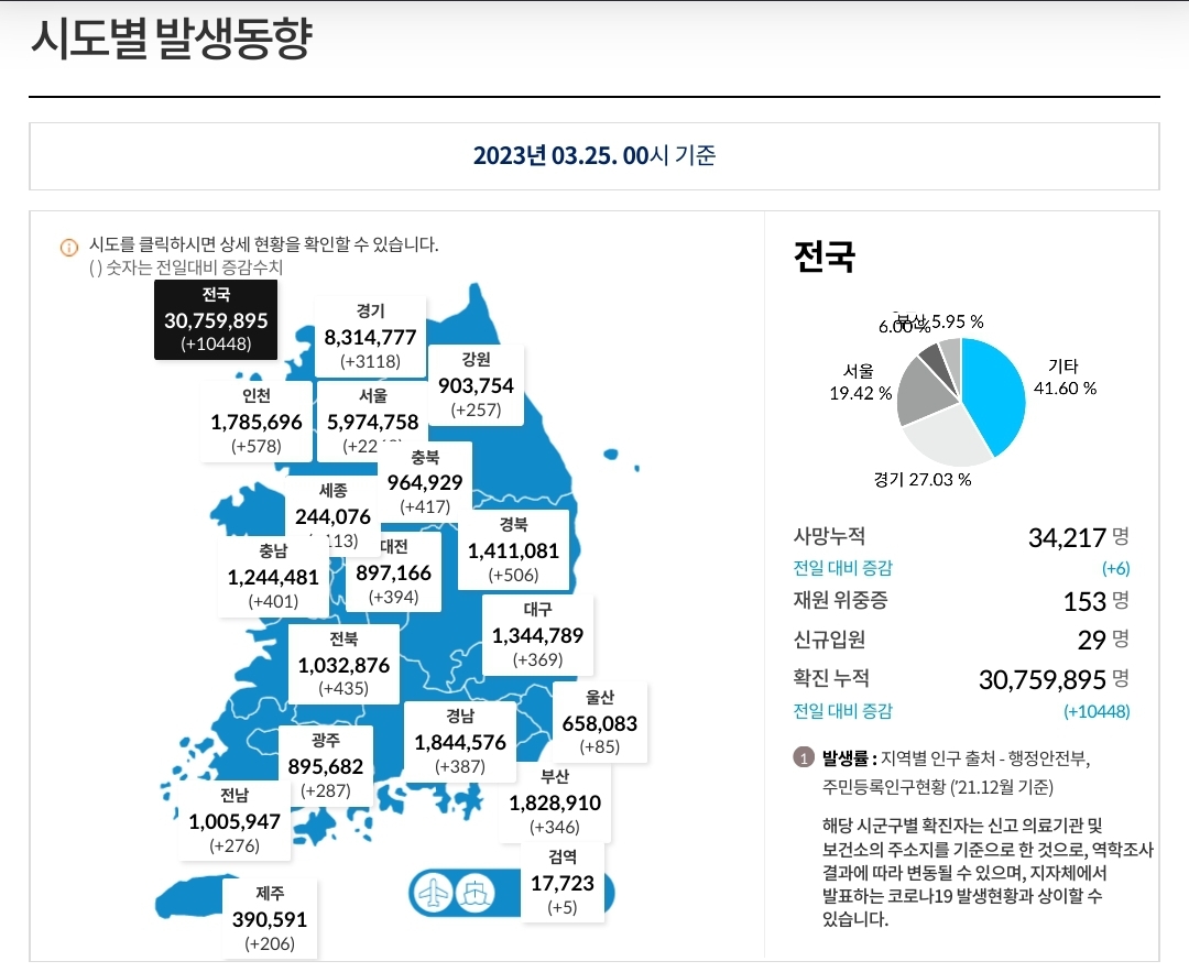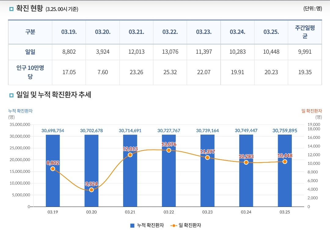 코로나19집계(2023.3.25. 0시기준) 확진 +1만, 사망 +6명, 중환자병상가동률 27% 본문