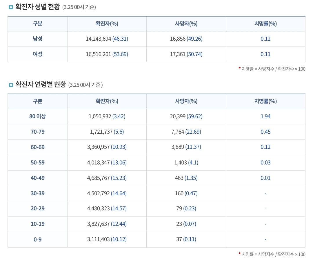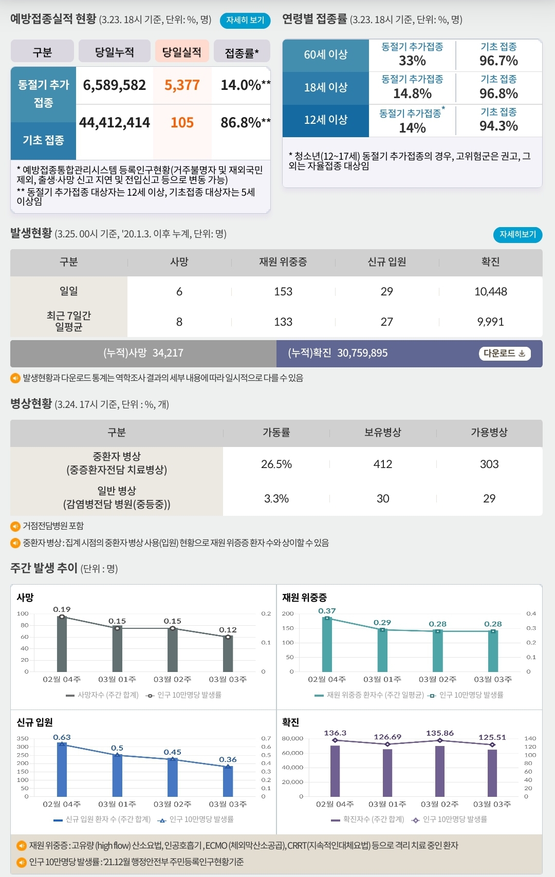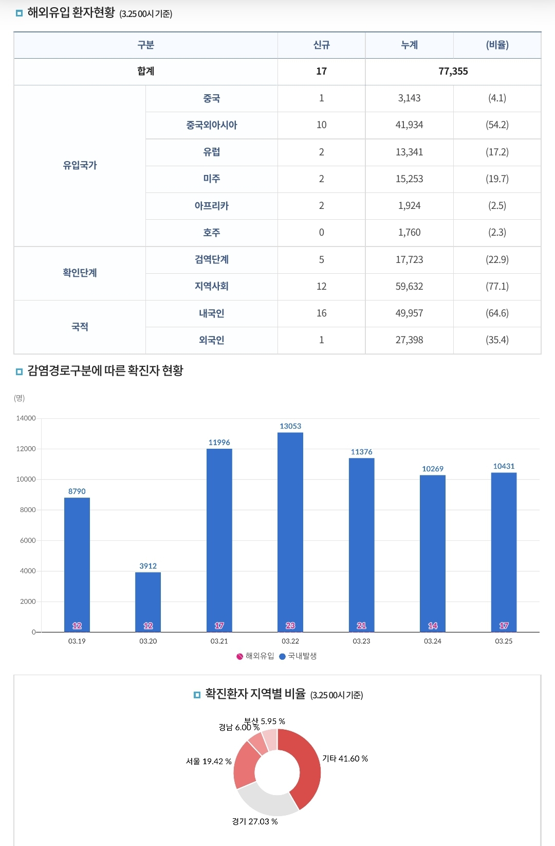 코로나19집계(2023.3.25. 0시기준) 확진 +1만, 사망 +6명, 중환자병상가동률 27% 본문