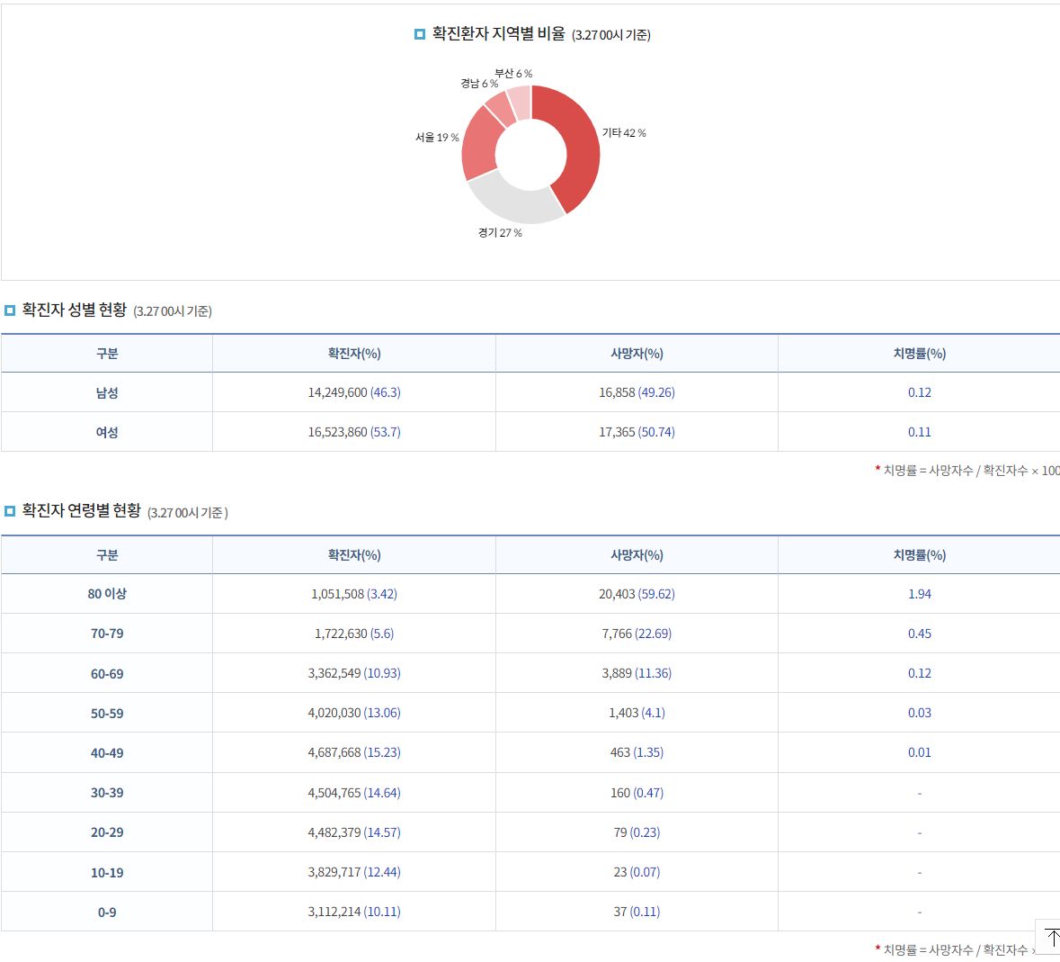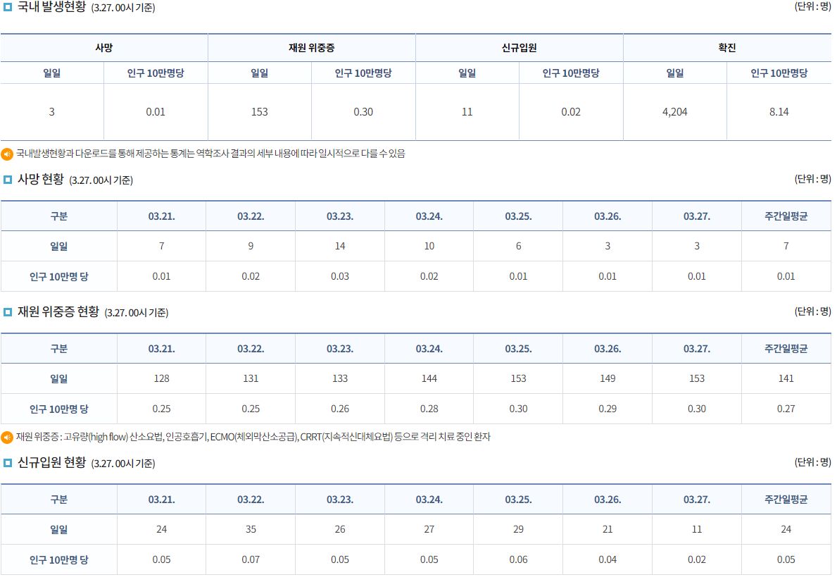코로나19집계(2023.3.27. 0시기준) 확진 +4천, 사망 +3명, 중환자병상가동률 27% 본문