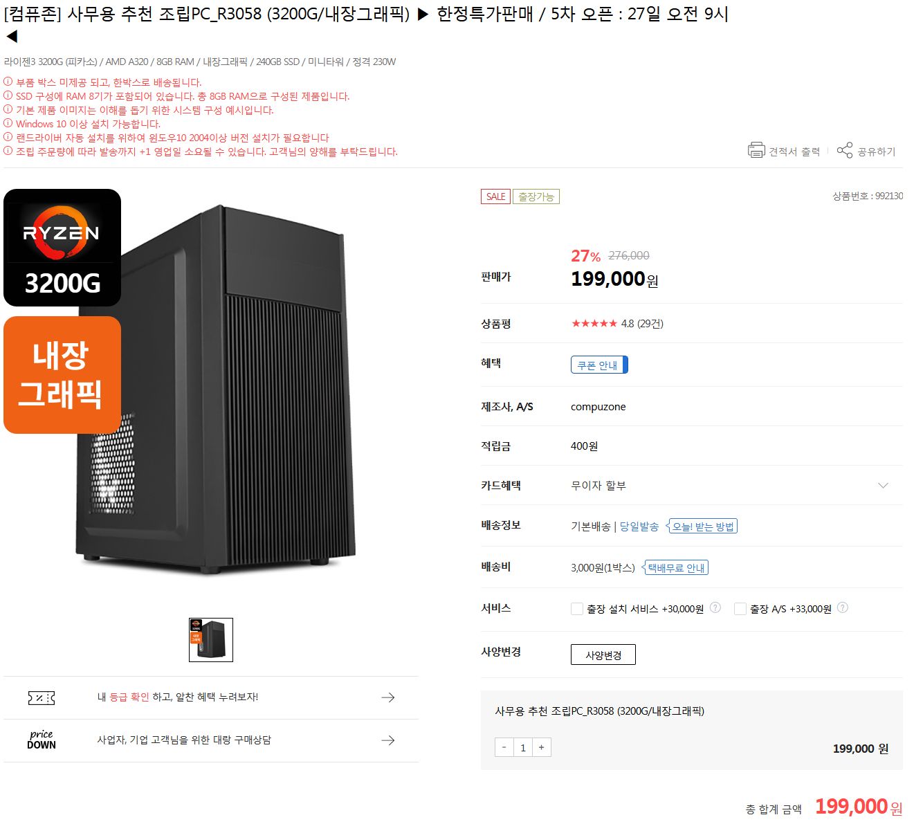 [컴퓨존] 사무용 추천 조립PC_R3058 (3200G/내장그래픽) ▶ 한정특가판매