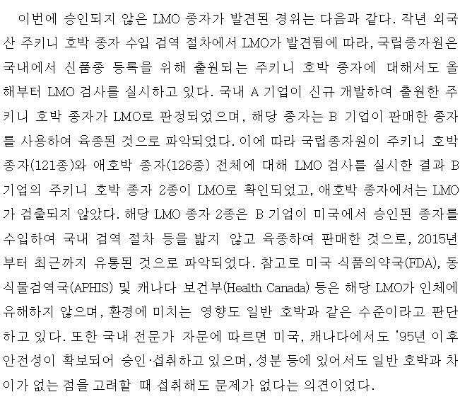 국내산 주키니 호박 종자에서 미승인 LMO 확인, 판매 중단 및 수거.폐기 조치