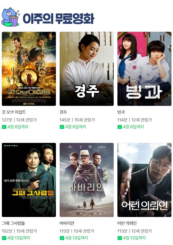 | (네이버시리즈온 무료영화) 아포칼립토, 암살자들, 두번할까요, 두근두근 내 인생 등 (0) | 2023.03.17 |