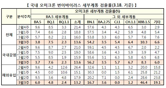 - BA.5(3.8%), BQ.1(7.5%), BQ.1.1(2.3%) 등을 포함하는 BA.5 세부계통은 13.6%(-2.4%p)로 확인되었다.