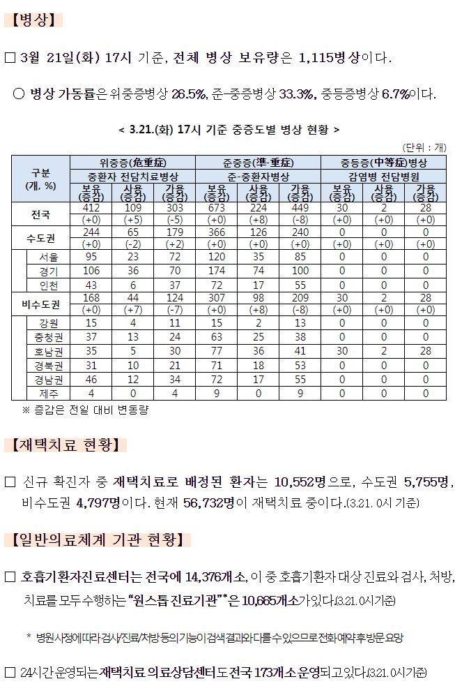 병상가동률/코로나19 병상 및 재택치료 등 현황