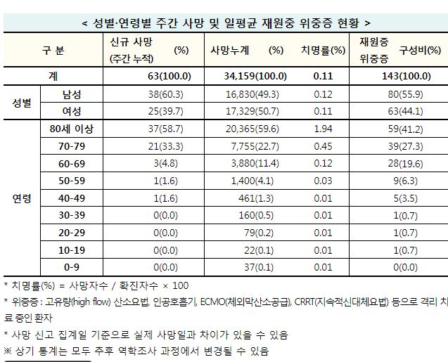 최근 1주간 연령대별 사망자 비중은 80세 이상이 58.7%, 70대가 33.3%, 60대가 4.8%로, 50대 이하 3.2%와 비교하면 고연령층 사망자가 대다수