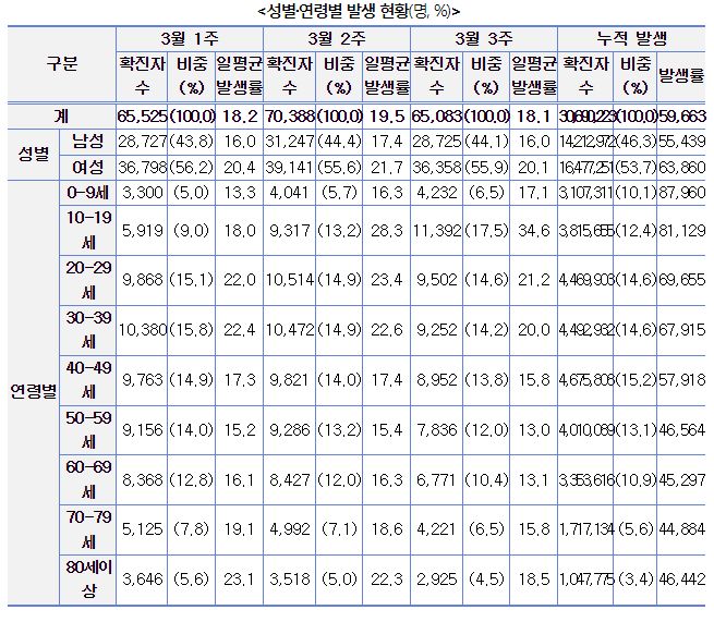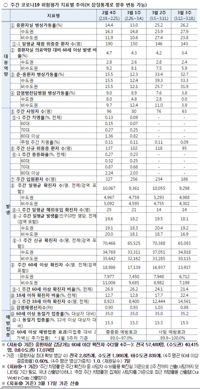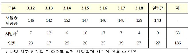 3월 3주 일평균 재원중 위중증 환자 중 60세 이상은 126명(88.1%), 일평균 사망자 중 60세 이상은 9명(100.0%)이었다.