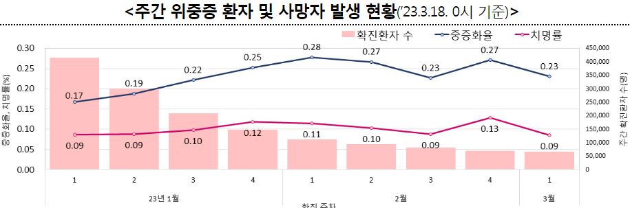 ○ 3월 1주차 확진자를 2주간 모니터링한 결과, 중증화율 0.23%, 치명률은 0.09%이었다.
