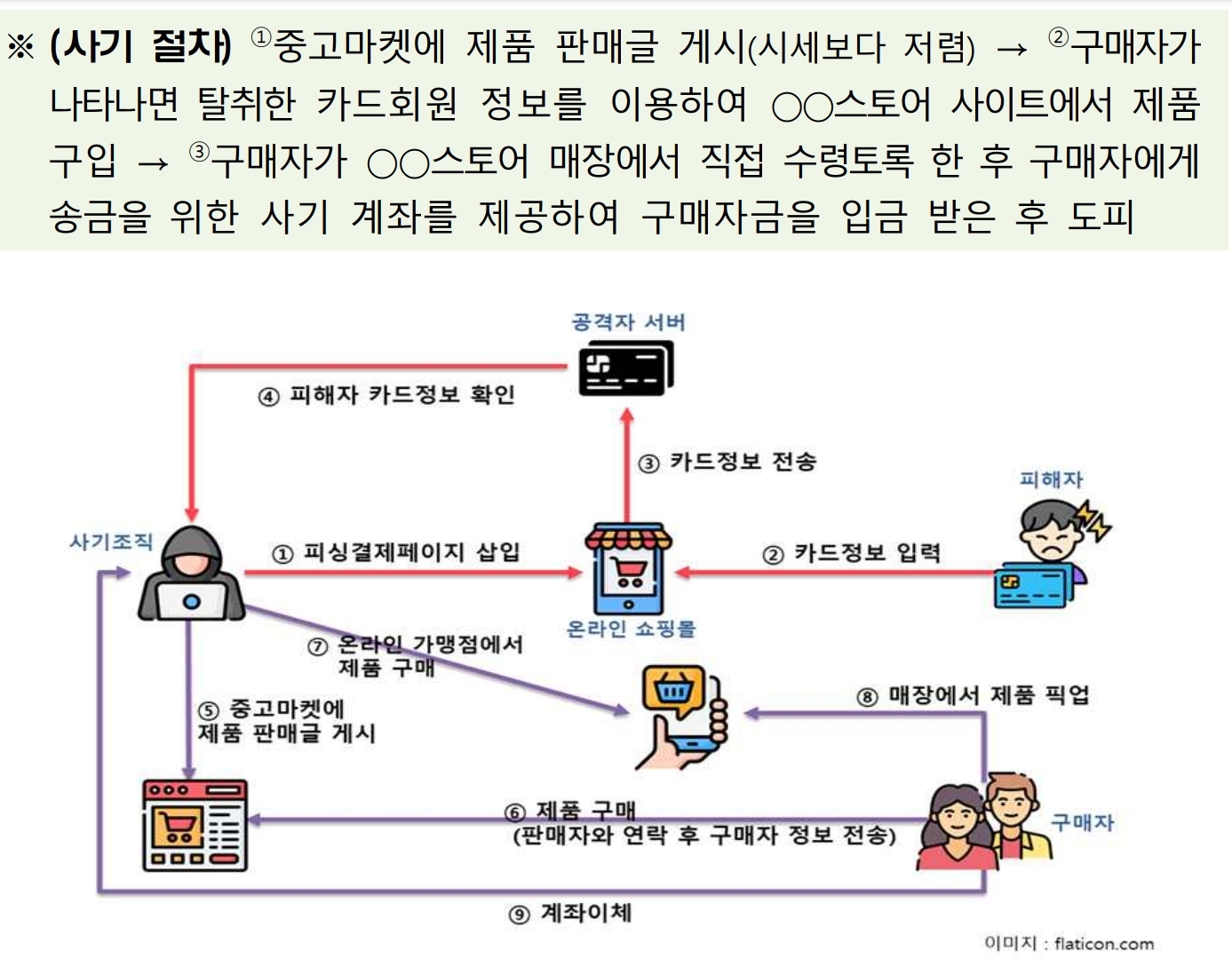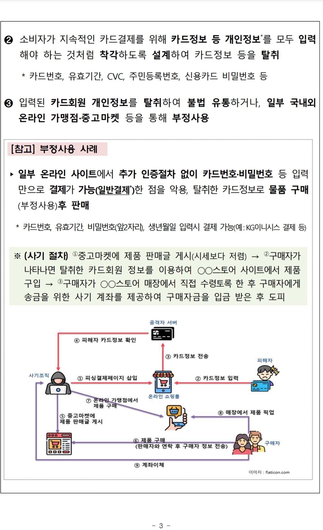 (범죄사이트에서) 결제창을 통해 탈취한 카드결제정보, 개인정보를 부정사용하는 방식 예시