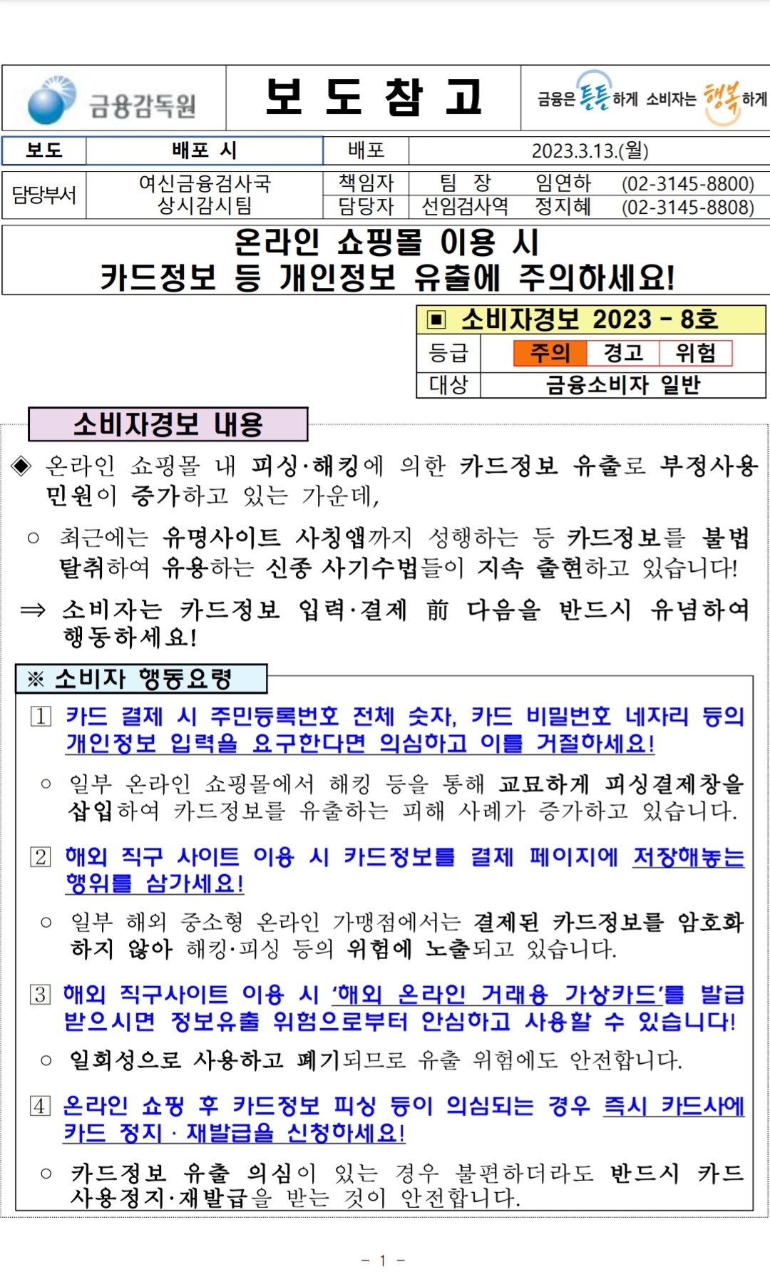 ■ 온라인 쇼핑몰 이용 시 개인정보 유출 주의 [소비자경보 2023-8호]