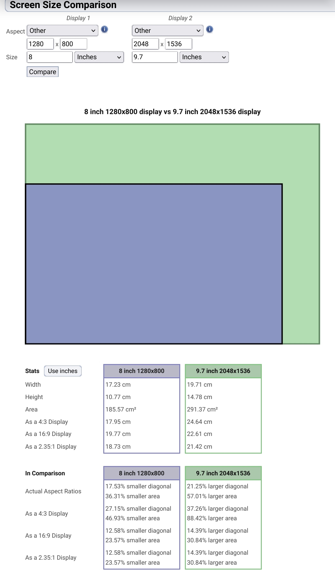 Summary In comparison to a 9.7 inch 2048x1536 TV a 8 inch 1280x800 is... 13% smaller diagonally and 24% smaller by area as a 16x9 display. 27% smaller diagonally and 47% smaller by area as a 4x3 display. More Web Toys ASCII Poster Make a Giant Poster