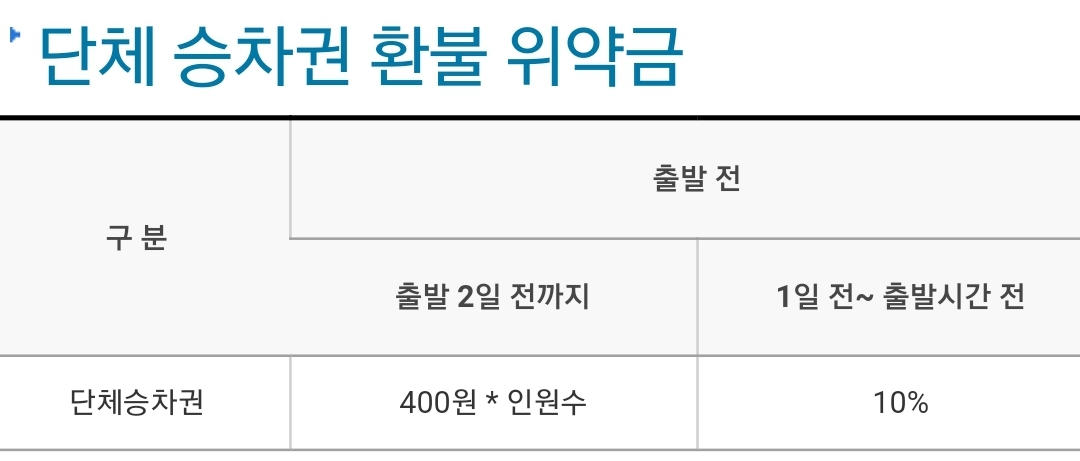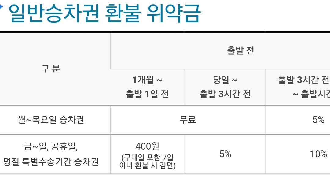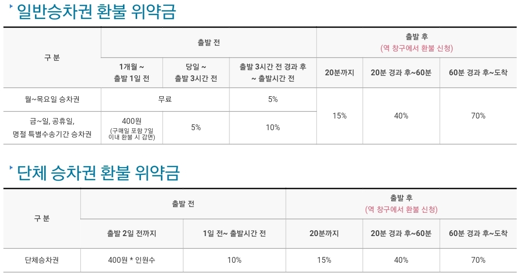ㅡ 구입한 승차권을 환불 하고자 하는 경우 환불 신청 시점에 따른 위약금이 발생합니다.