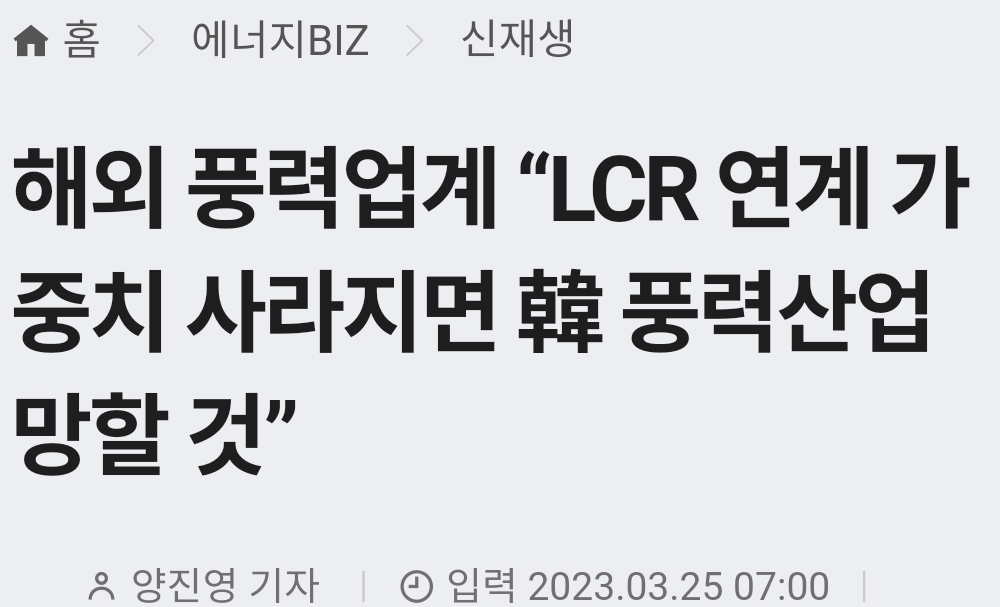 ㅡ 정부의 이번 LCR폐지 검토가 국내 산업의 활성화를 간과한 결과인 만큼 풍력산업도 자생력을 잃게 될 것이라는 전망. (기사 속 외국기업들도 그렇게 단정)