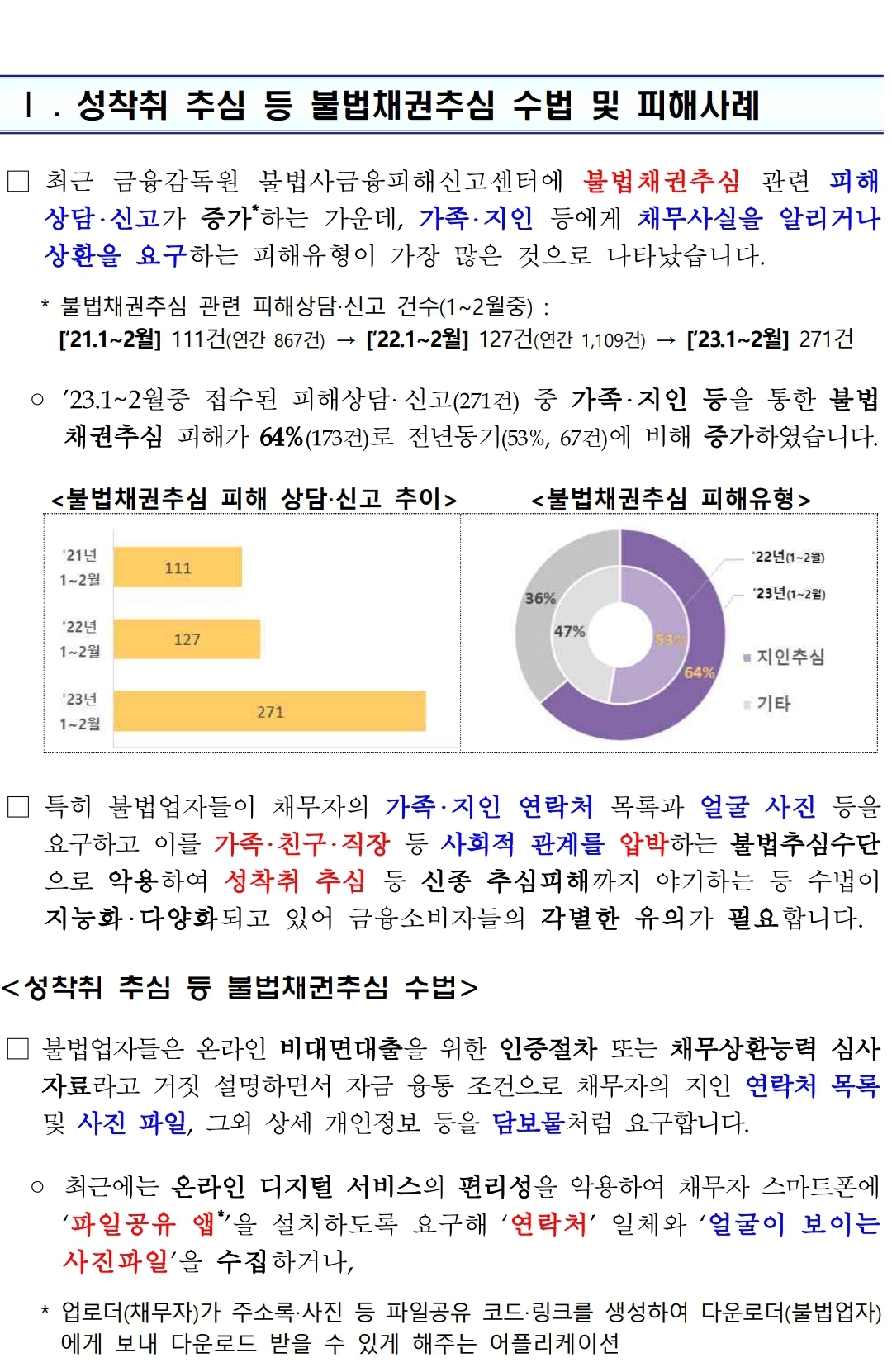 최근 가족·지인을 통한 불법채권추심 피해상담·신고가 크게 증가하는 가운데, ‘성착취 추심’ 등 신종 추심피해 사례가 발생하고 있어 소비자의 각별한 유의가 필요합니다.