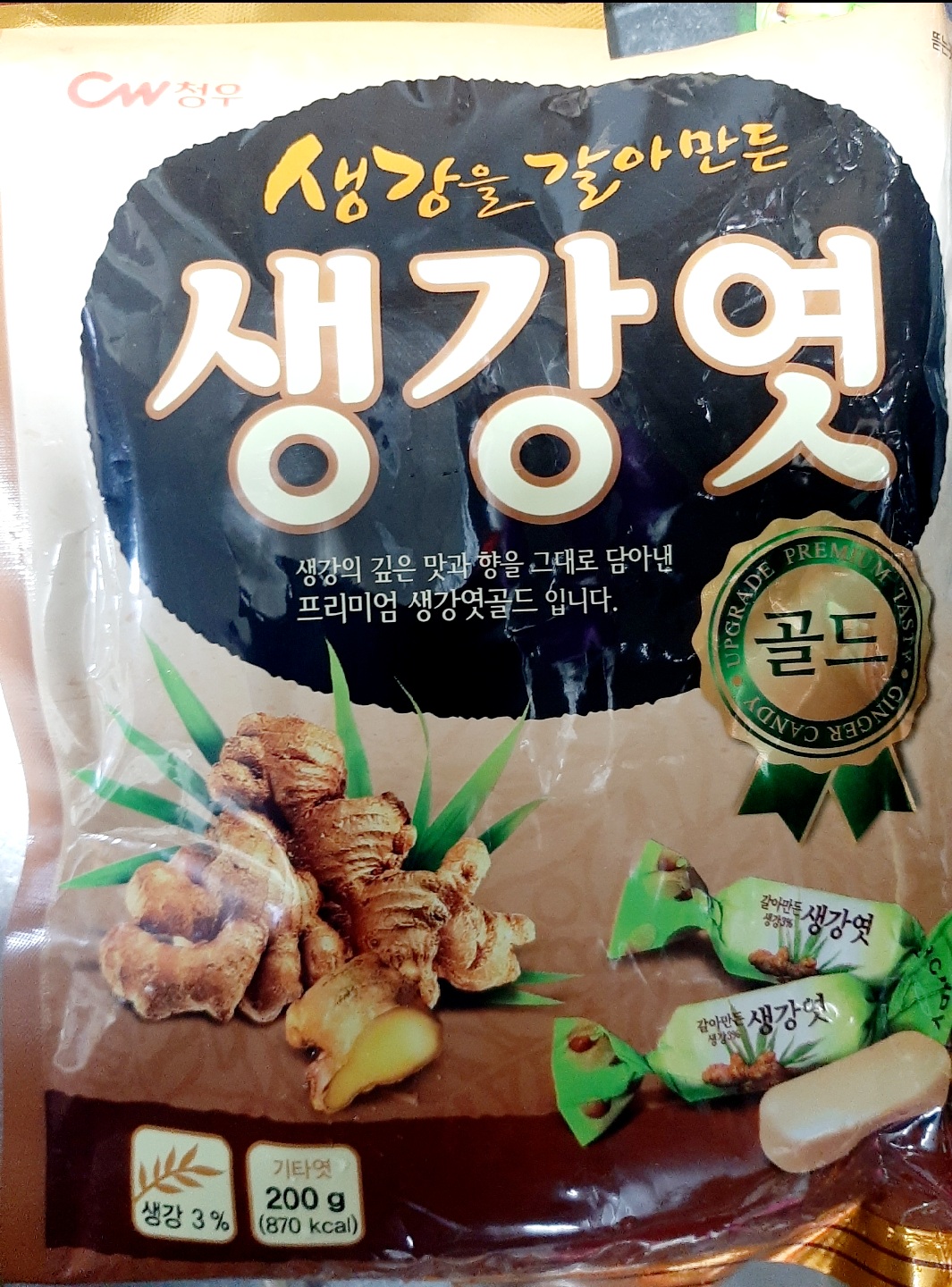 사탕류같이 단단하지는 않고, 캬라멜같이 생겼지만 처음부터 말랑한 것도 아닙 니다. 생강맛납니다. 목캔디처럼 좀 더 진해도 됐겠다싶지만 그 마트에 생강캔디류는 이것뿐이라.