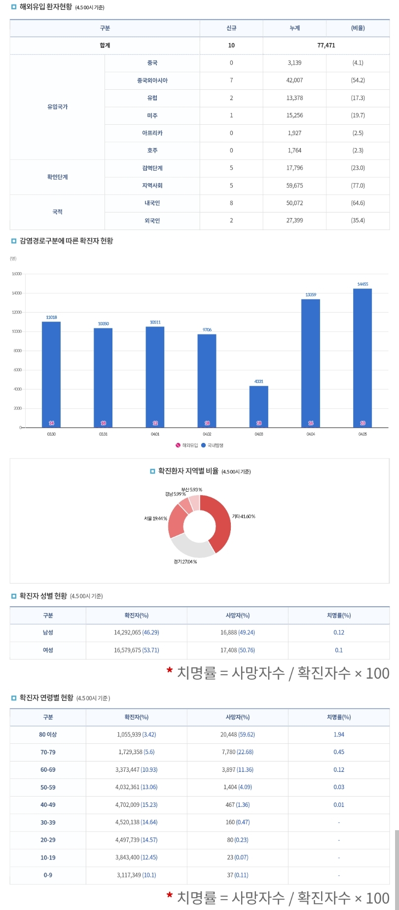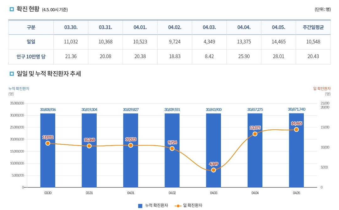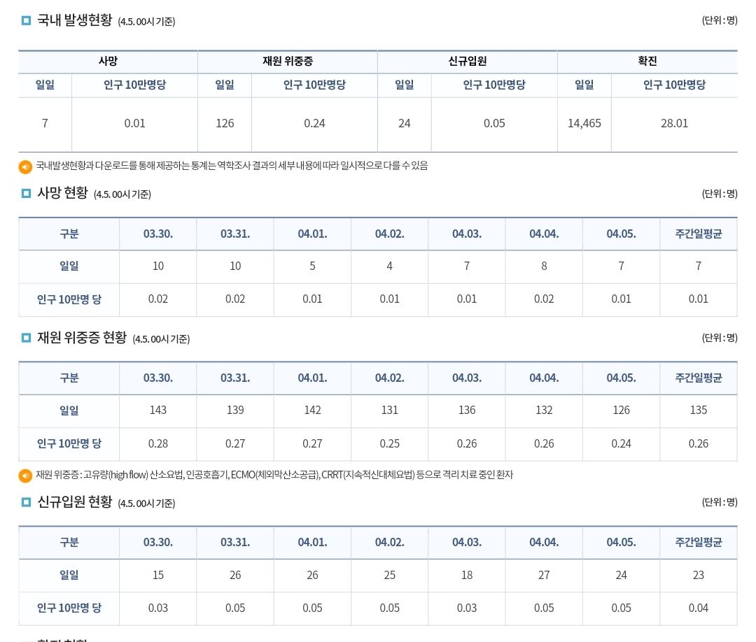 코로나19집계(2023.4.5. 0시기준) 확진 +1.4만, 사망 +7명, 중환자병상가동률 24% 본문