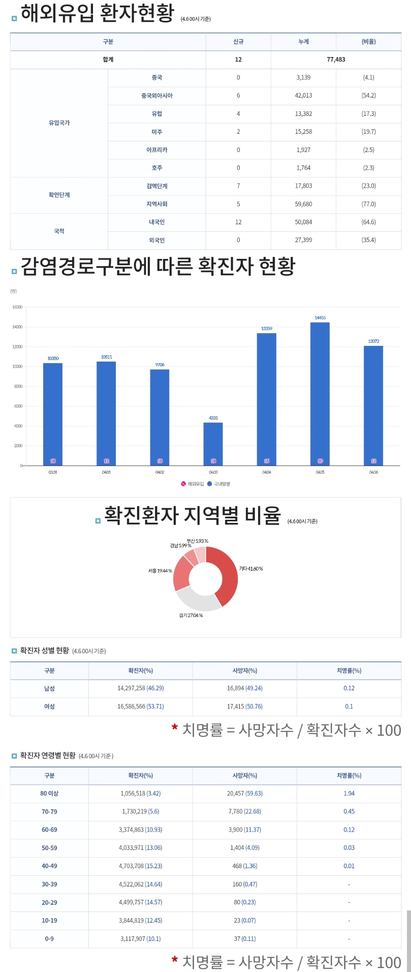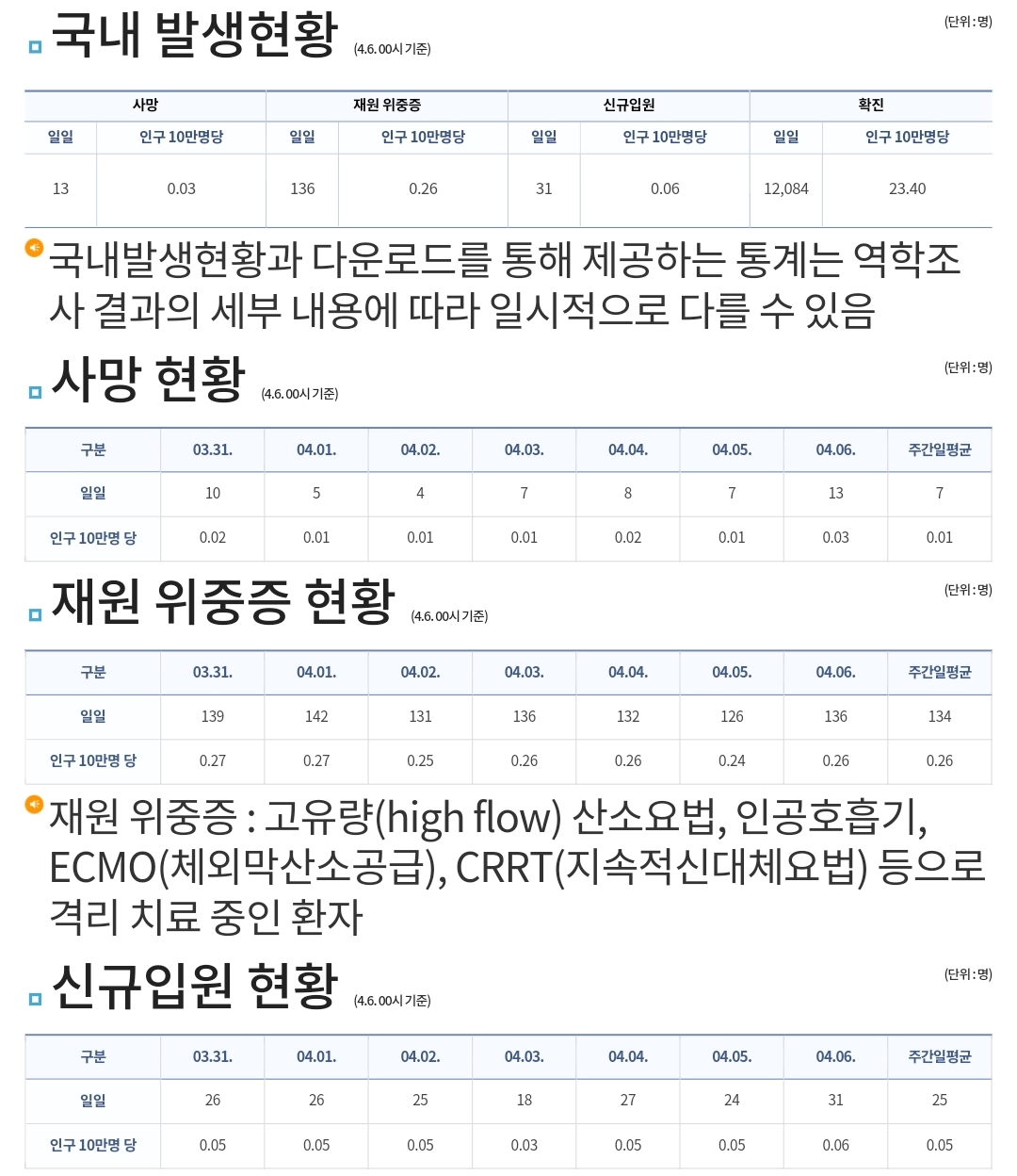 코로나19집계(2023.4.6. 0시기준) 확진 +1.2만, 사망 +13명, 중환자병상가동률 32% 본문