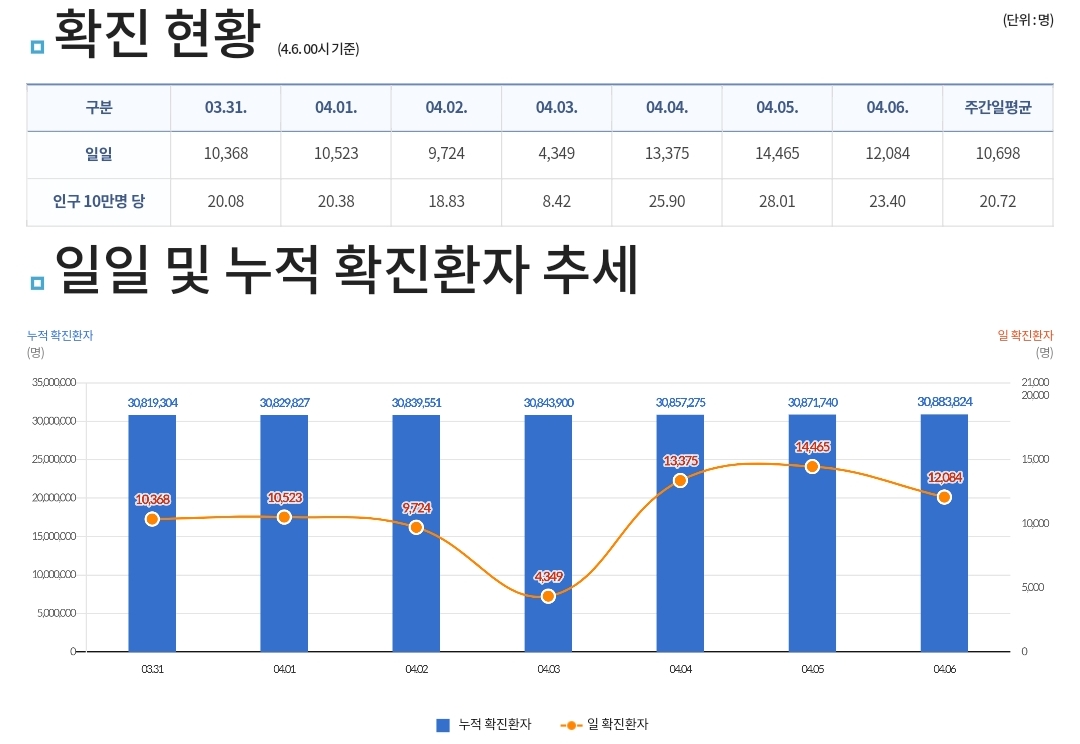 코로나19집계(2023.4.6. 0시기준) 확진 +1.2만, 사망 +13명, 중환자병상가동률 32% 본문