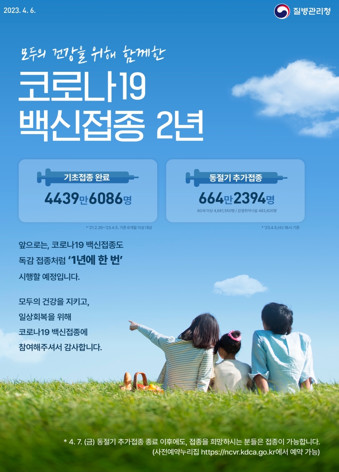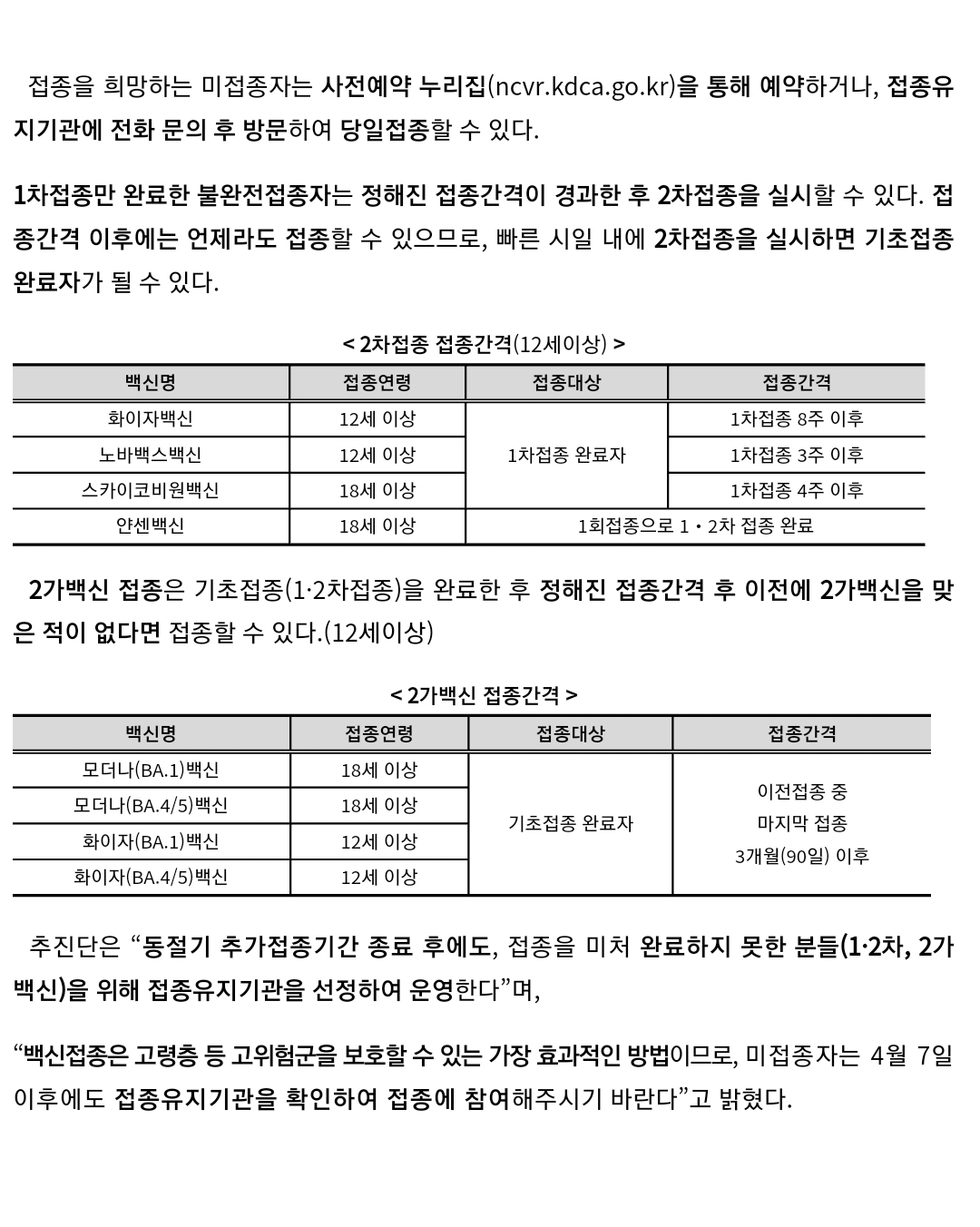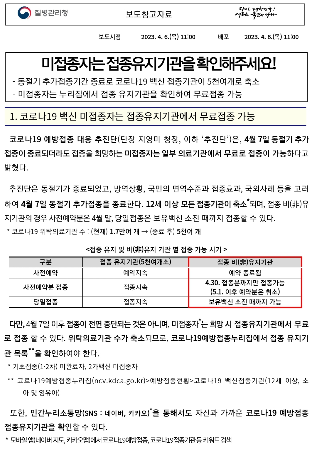 코로나19(2023.4.7) 동절기 추가접종 종료 후에도, 접종을 희망하는 미접종자는 지정 의료기관에서 무료접종가능 본문
