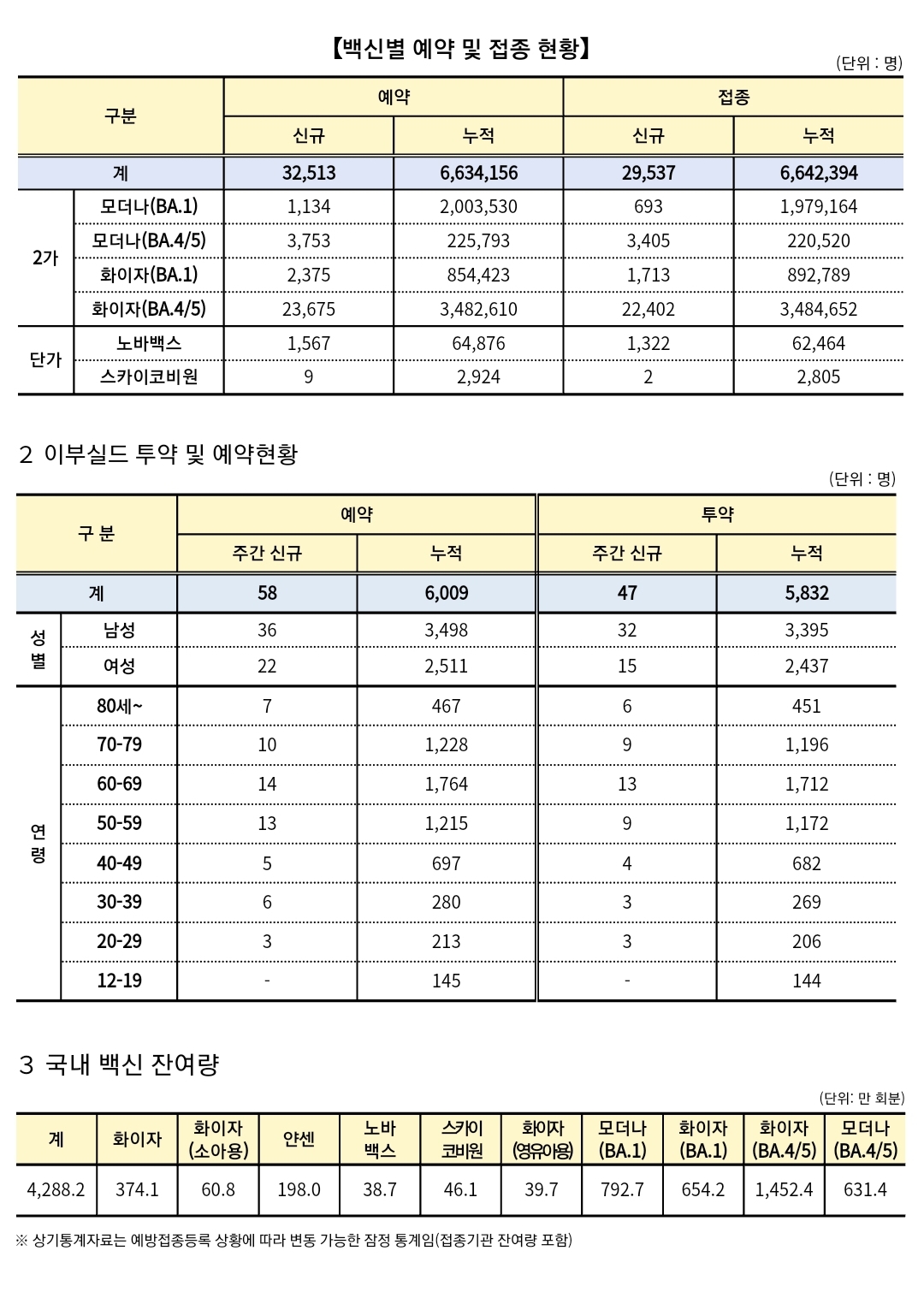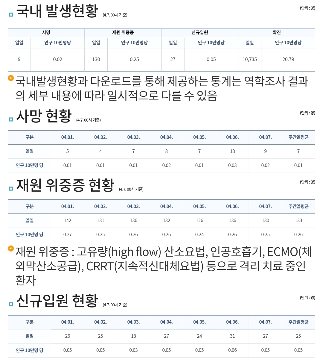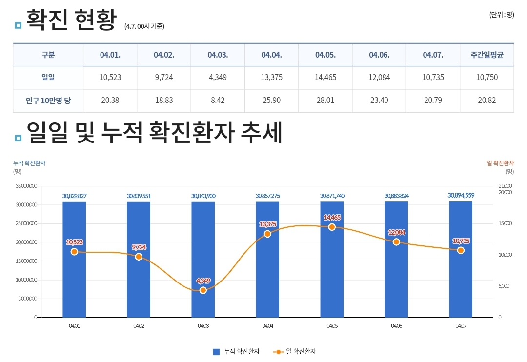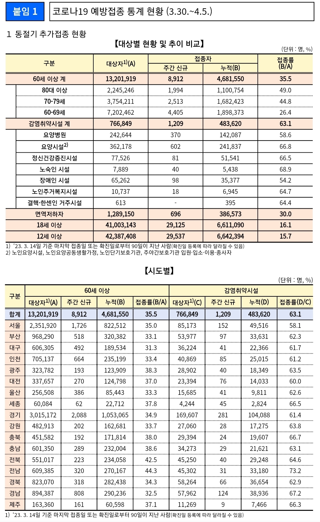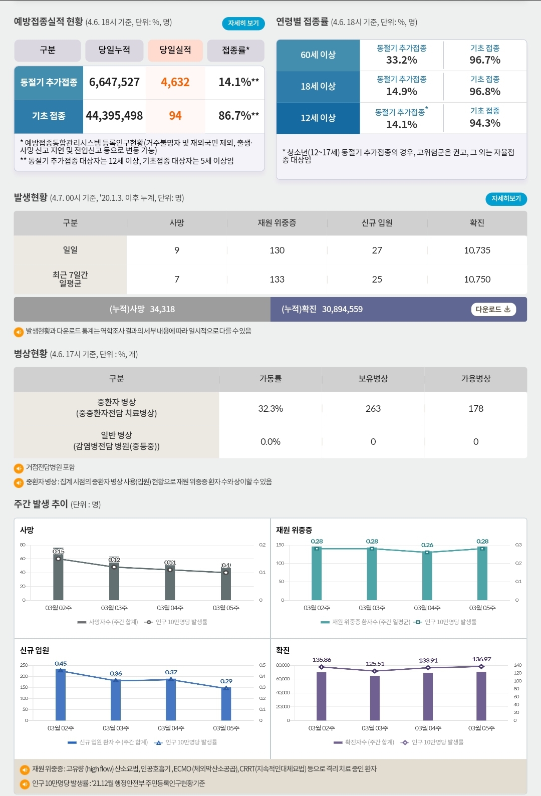 코로나19집계(2023.4.7. 0시기준) 확진 +1.1만, 사망 +9명, 중환자병상가동률 32%, 주간예방접종통계 본문