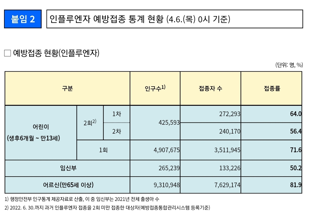 인플루엔자 예방접종 통계 현황 (4.6.(목) 0시 기준)