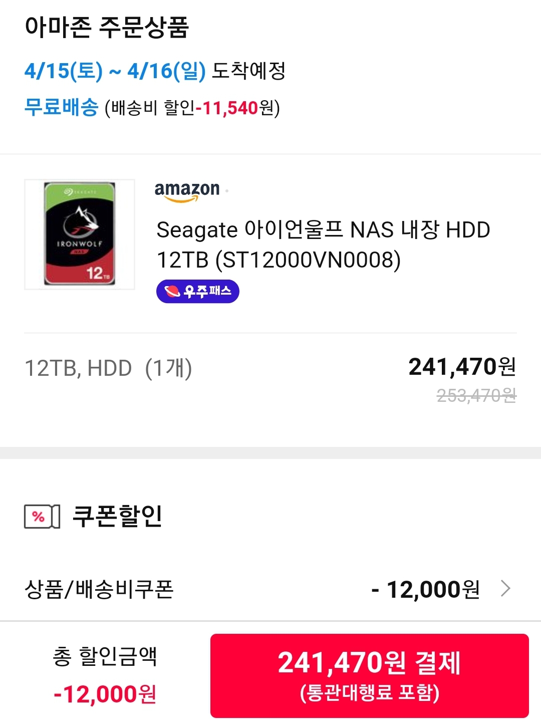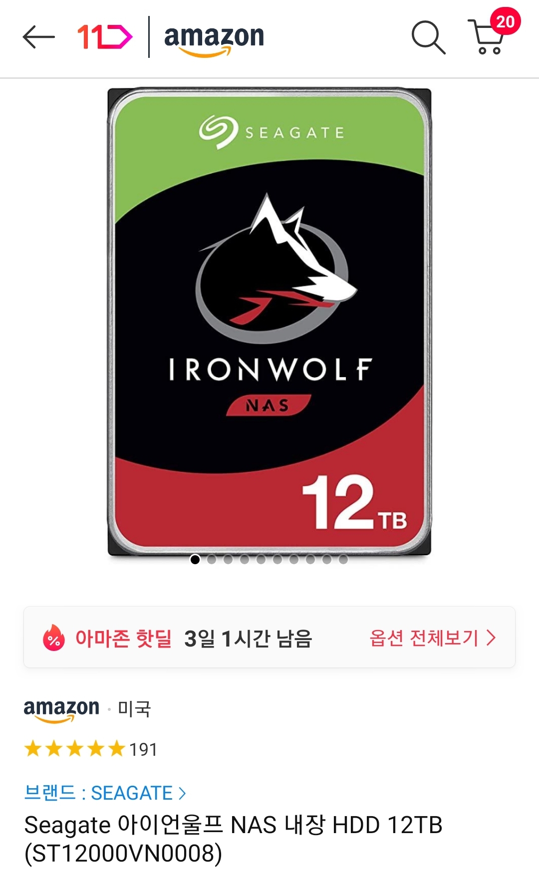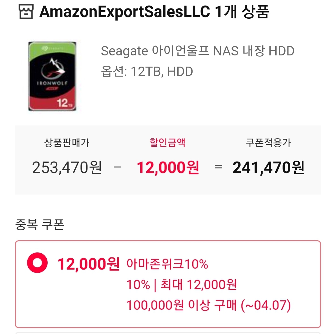 (11번가-아마존) 시게이트 아이언울프 12TB HDD (ST12000VN0008) (~24만원/일반) 본문